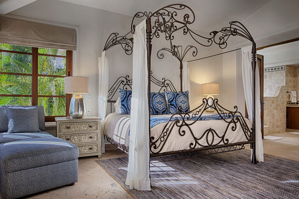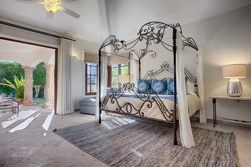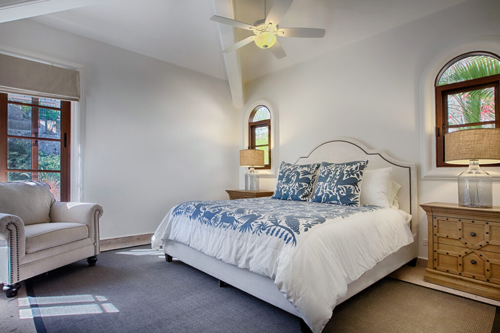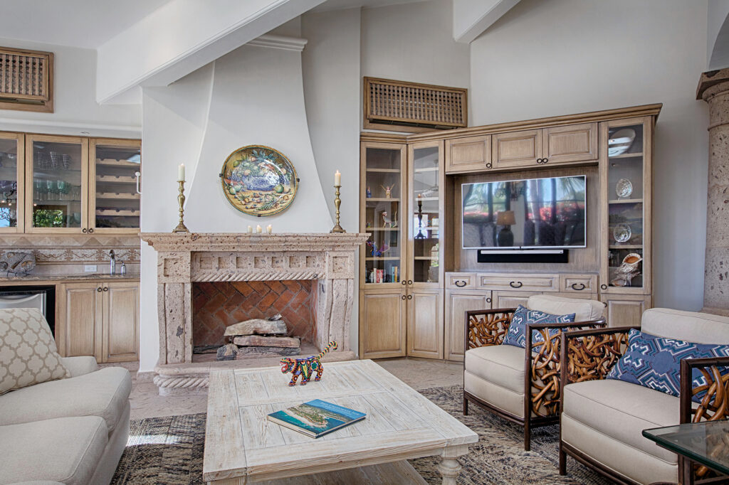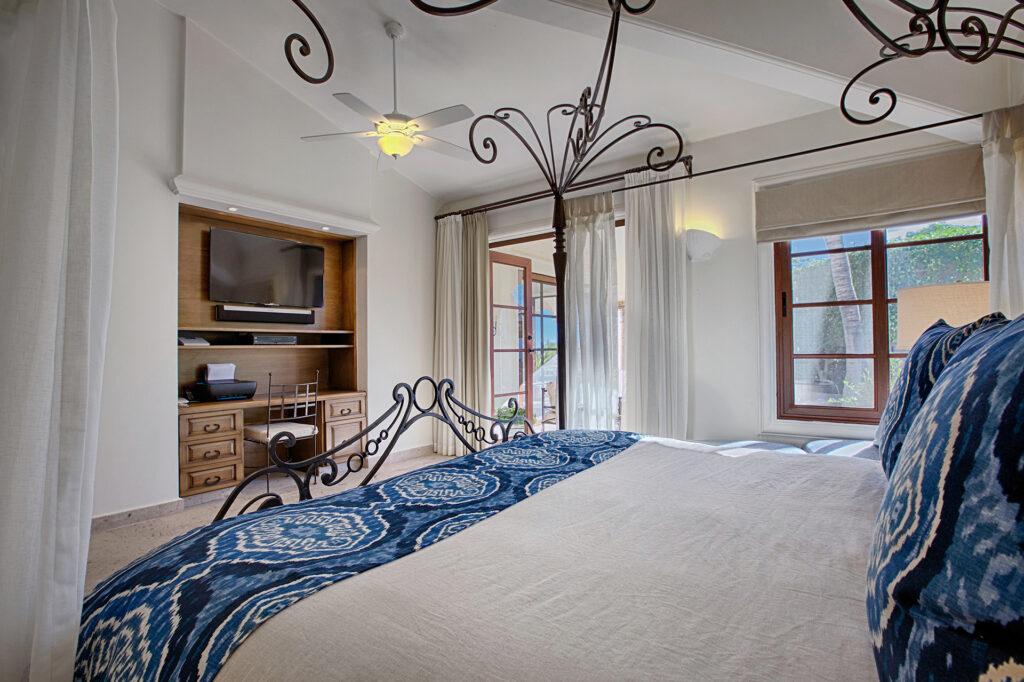 Inside, you’ll find a gourmet kitchen equipped with top-tier appliances and the option for private chef services. The villa’s spacious layout includes a comfortable living and dining area, perfect for gatherings. The master suite features a king-sized bed, en-suite bathroom, walk-in closet, and TV. Four additional guest suites in detached casitas offer various bedding configurations, each with its own bathroom and high-quality amenities.