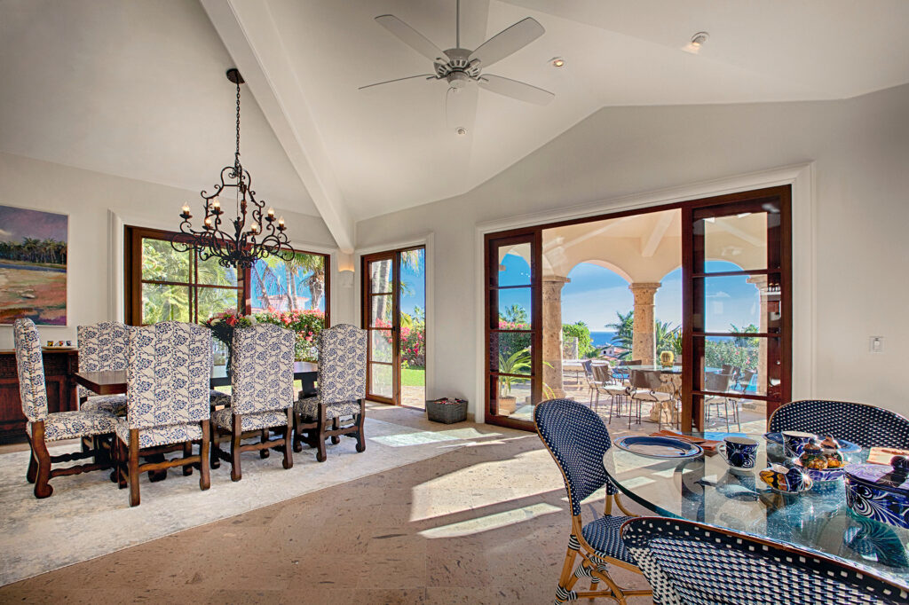 Outside, the large covered deck and pool area provide a serene setting to enjoy the landscape, with a butler service available for an added touch of luxury. A traditional thatched Palapa offers a cool retreat from the sun.