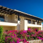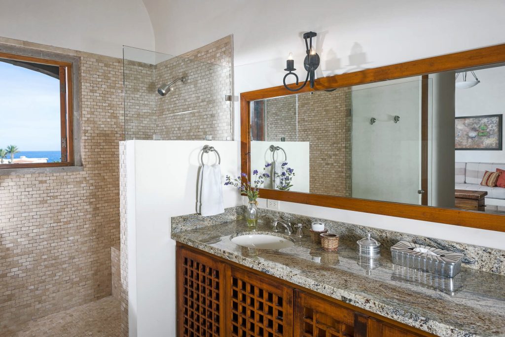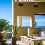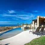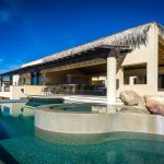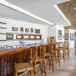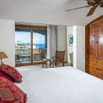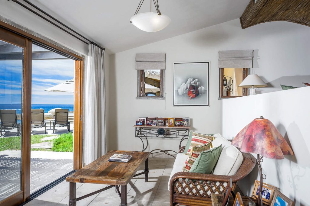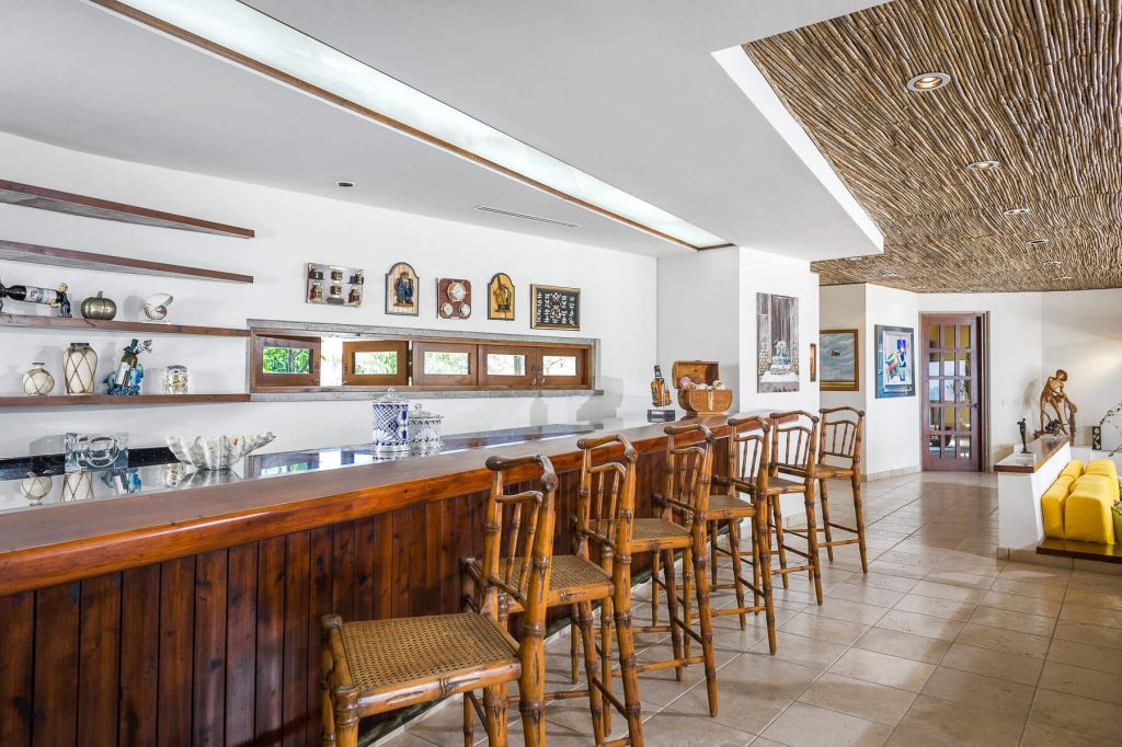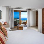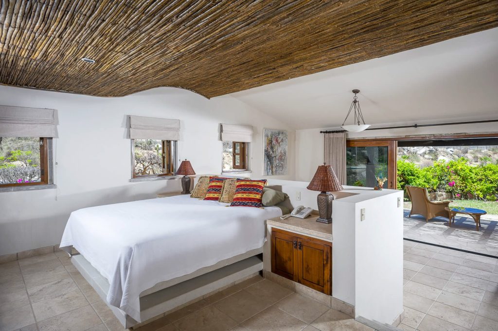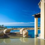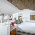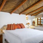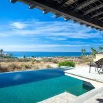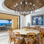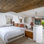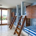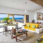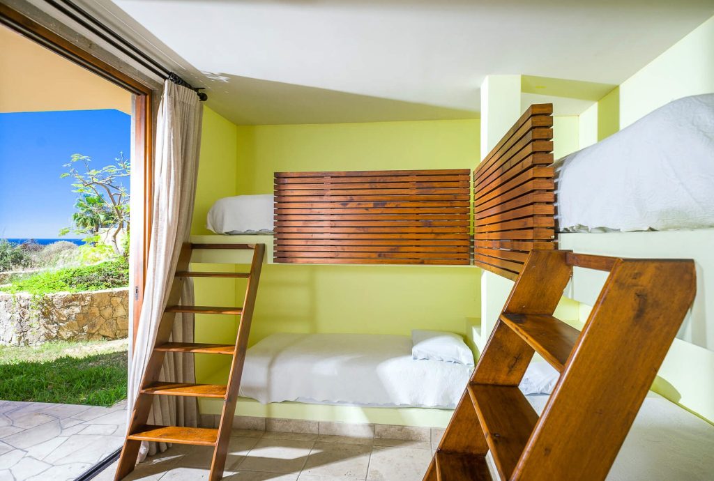 Casa Tita, a luxury property with five master suites, each featuring king beds, ensuite baths, and private balconies, offers stunning ocean views. The villa also includes three children’s rooms, each with two sets of twin bunk beds and private baths. The thoughtful layout separates common areas from bedrooms to ensure guest privacy. The living and dining area, characterized by floor-to-ceiling windows and white walls, emanates brightness and offers plenty of comfortable seating, including poolside lounge chairs on the terrace.