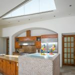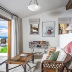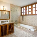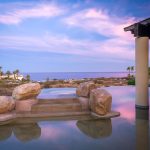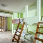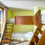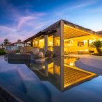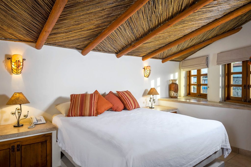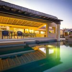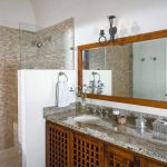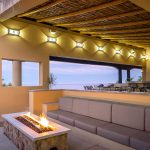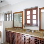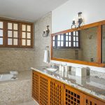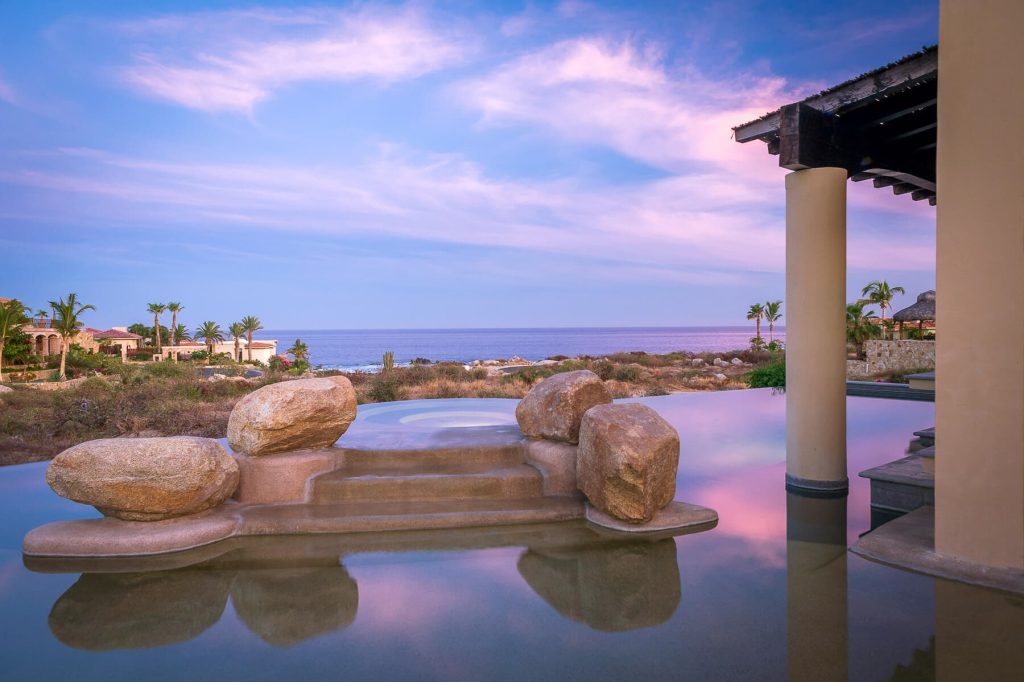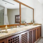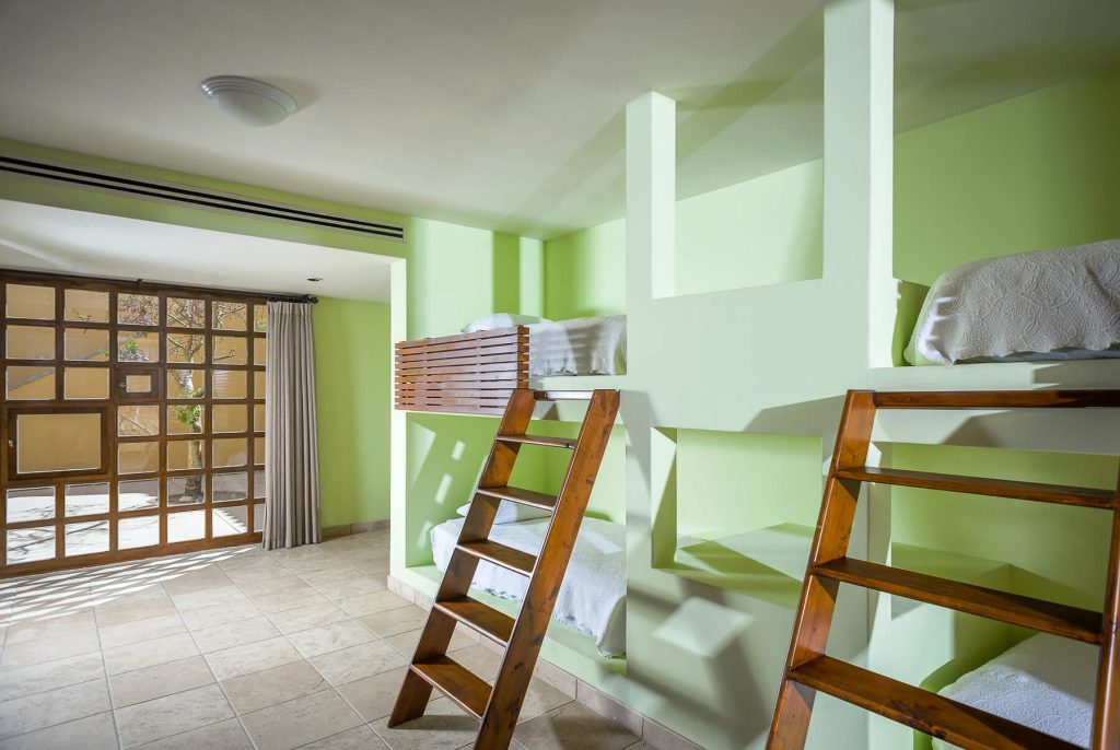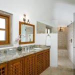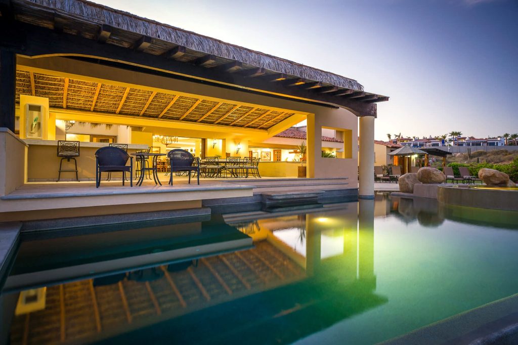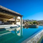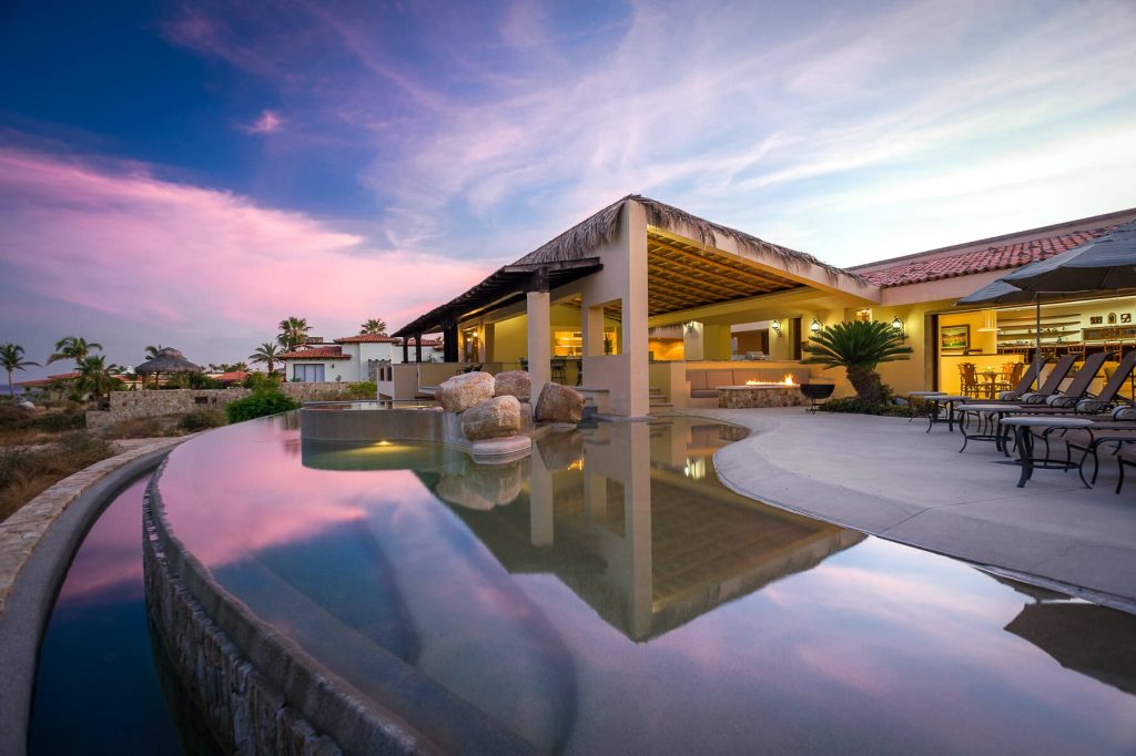 Casa Tita, a luxury property with five master suites, each featuring king beds, ensuite baths, and private balconies, offers stunning ocean views. The villa also includes three children’s rooms, each with two sets of twin bunk beds and private baths. The thoughtful layout separates common areas from bedrooms to ensure guest privacy. The living and dining area, characterized by floor-to-ceiling windows and white walls, emanates brightness and offers plenty of comfortable seating, including poolside lounge chairs on the terrace.