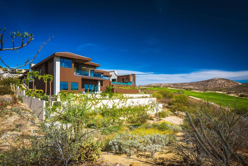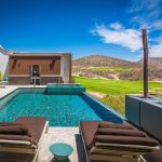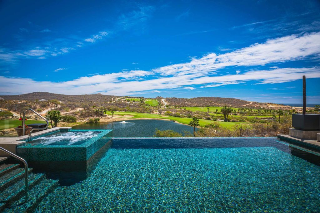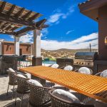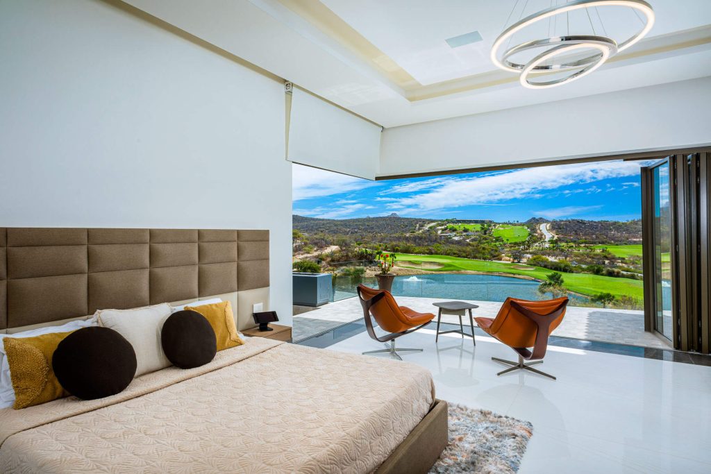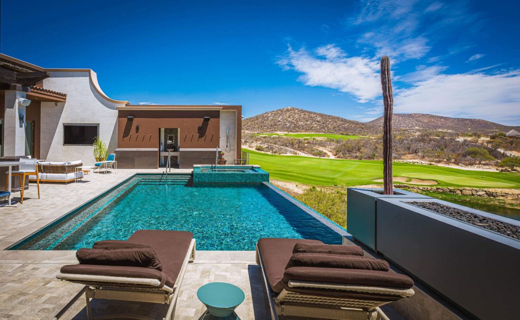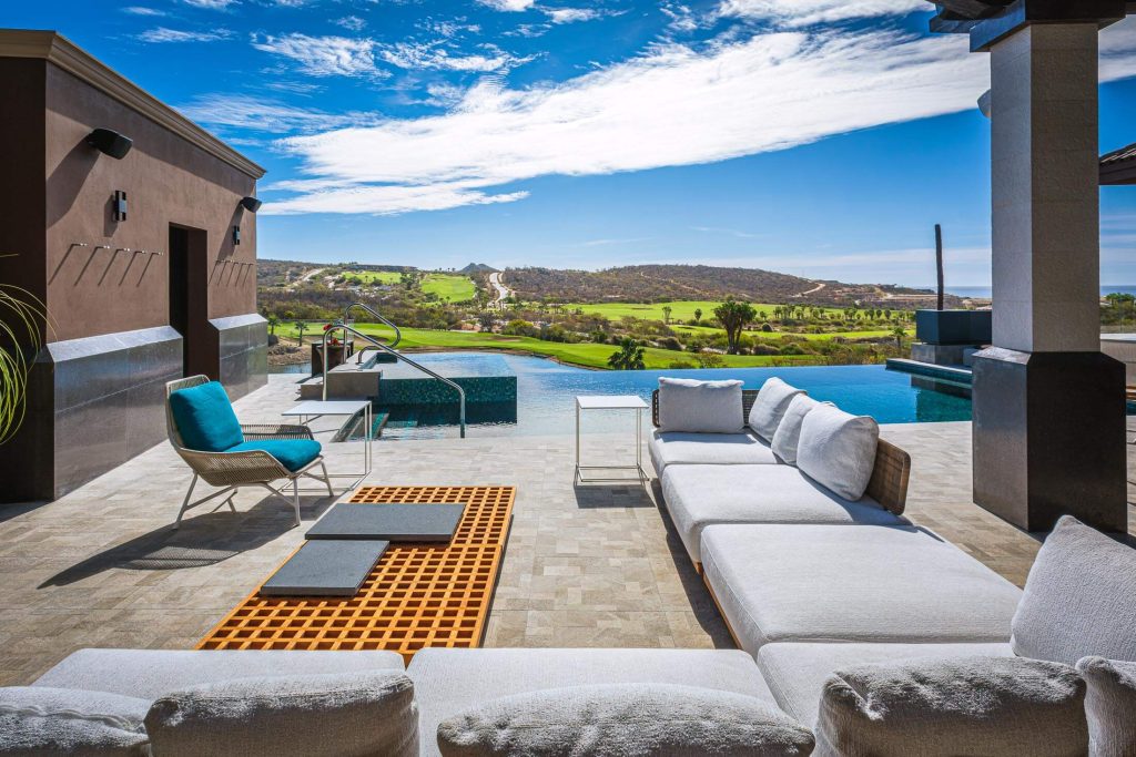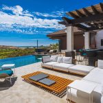 Stepping outside, guests are greeted with an outdoor kitchen complete with a gas BBQ grill and pizza oven. The outdoor lounge and dining area offer stunning views of the nearby golf course and the rolling hillside, while the private swimming pool and Jacuzzi promise relaxation and serenity. Exclusive access to the Puerto Los Cabos Beach Club – complete with an infinity-edge pool, sports bar, and beach access – and proximity to the marina underscore the villa’s allure. The secure, gated community of El Altillo further elevates the appeal of this upscale Puerto Los Cabos accommodation.