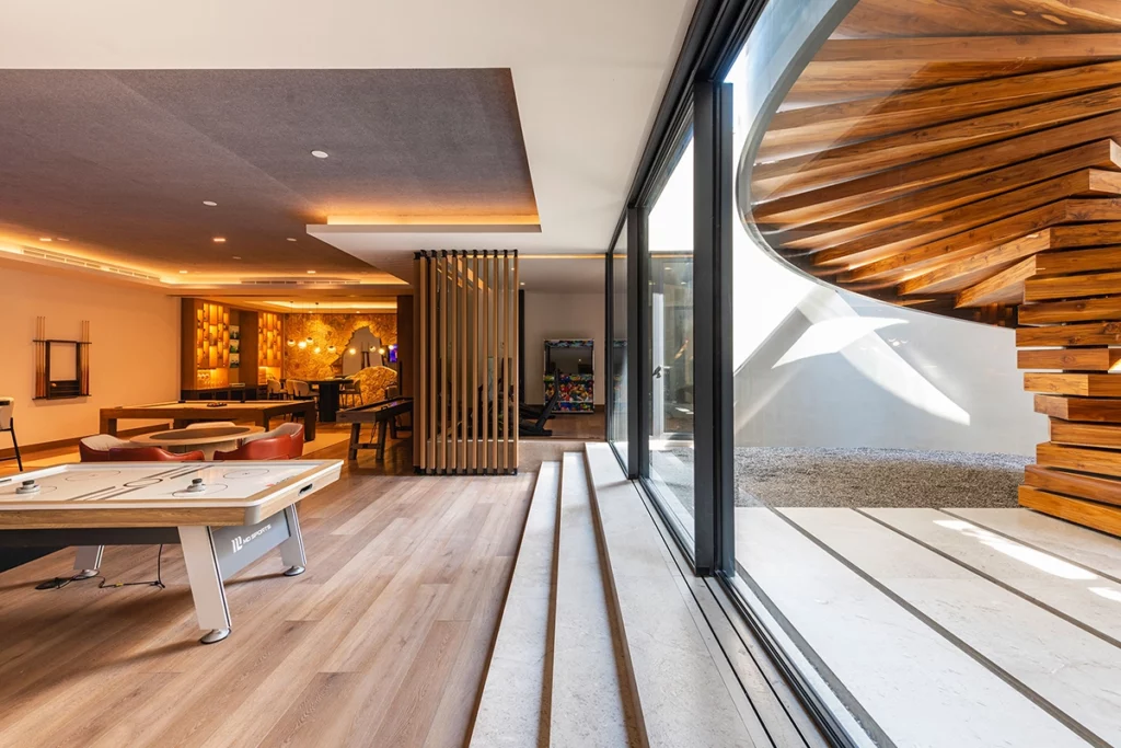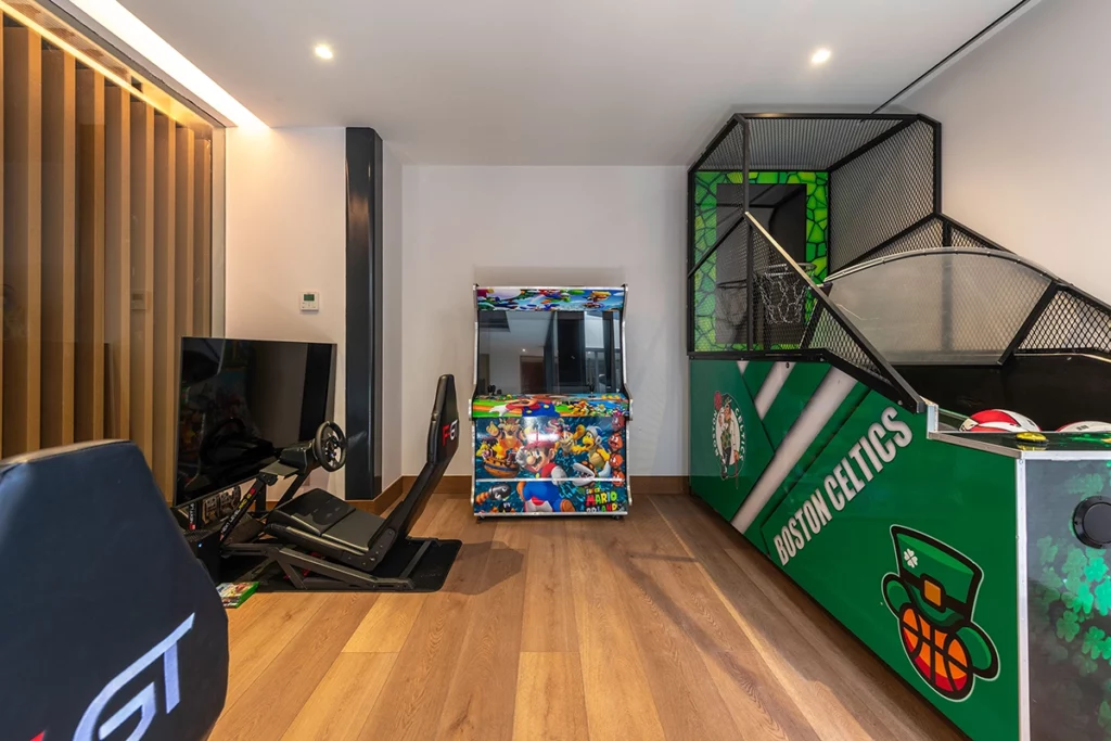 Designed with both relaxation and entertainment in mind, the home features a private pool with jacuzzi, a dedicated 19th hole lounge, state-of-the-art media room, game room, and a fully equipped gym. An elevator ensures easy access across all levels, making every corner of the estate effortlessly accessible.