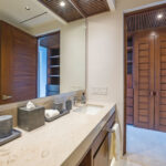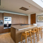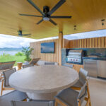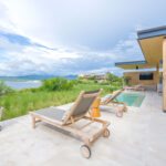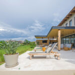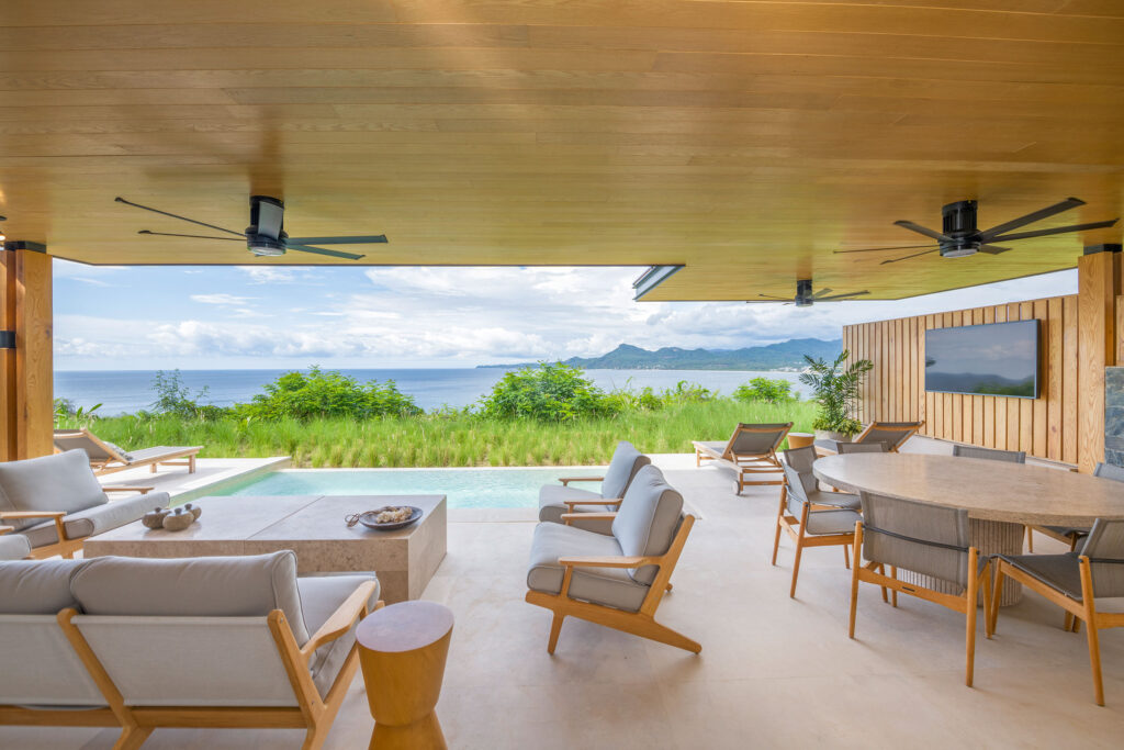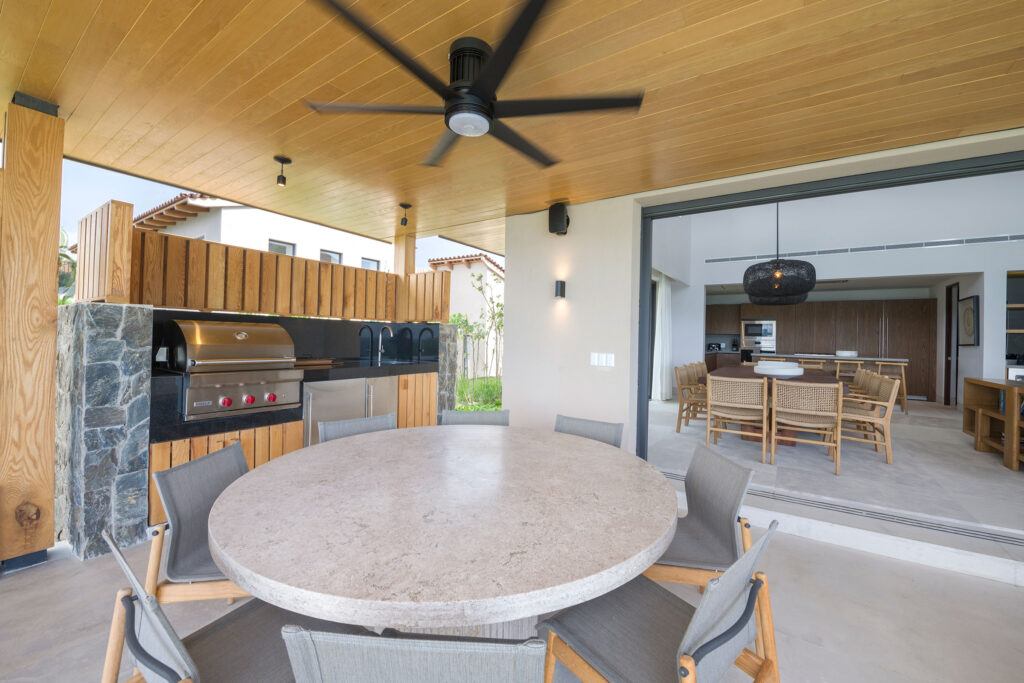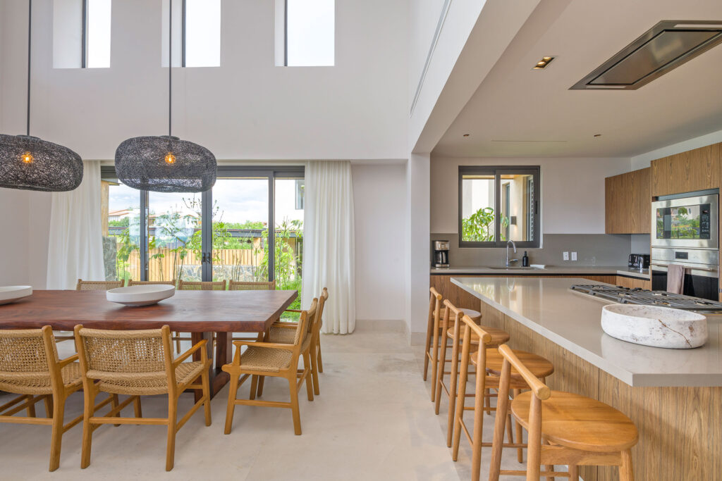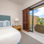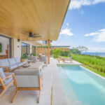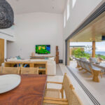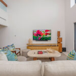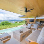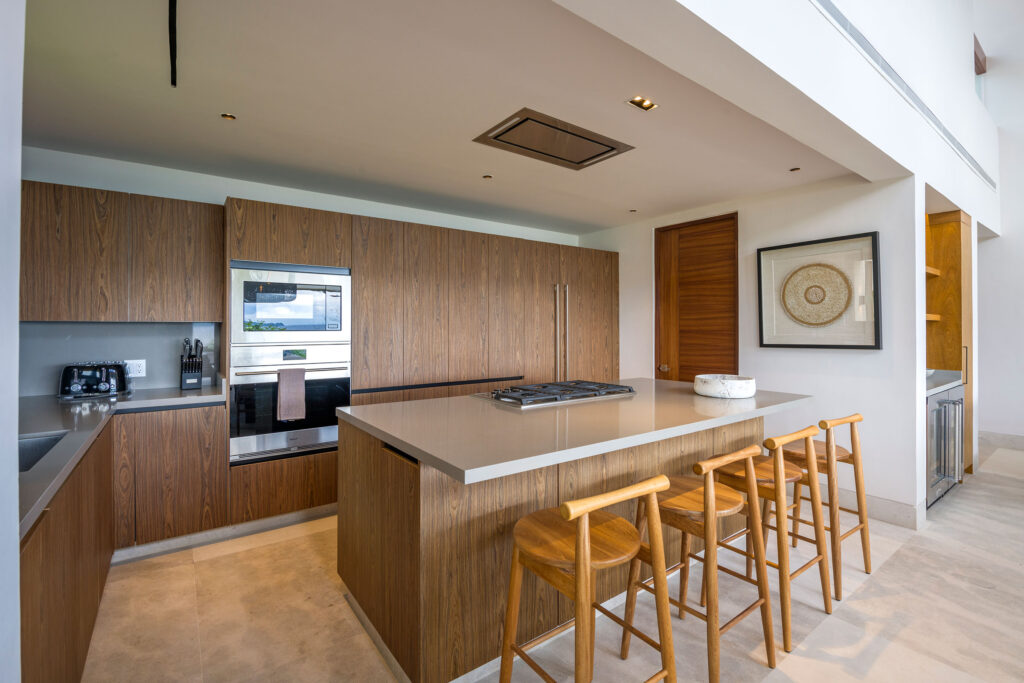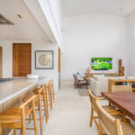 Surrounded by lush tropical foliage, the outdoor spaces feature a refreshing plunge pool, sun loungers, and a fully equipped al fresco kitchen—perfect for open-air dining and relaxation. Inside, the villa blends modern sophistication with natural textures, offering spacious living areas that exude comfort and tranquility.