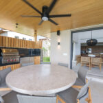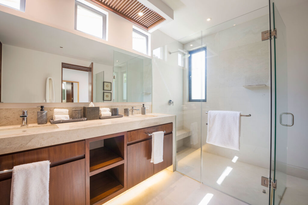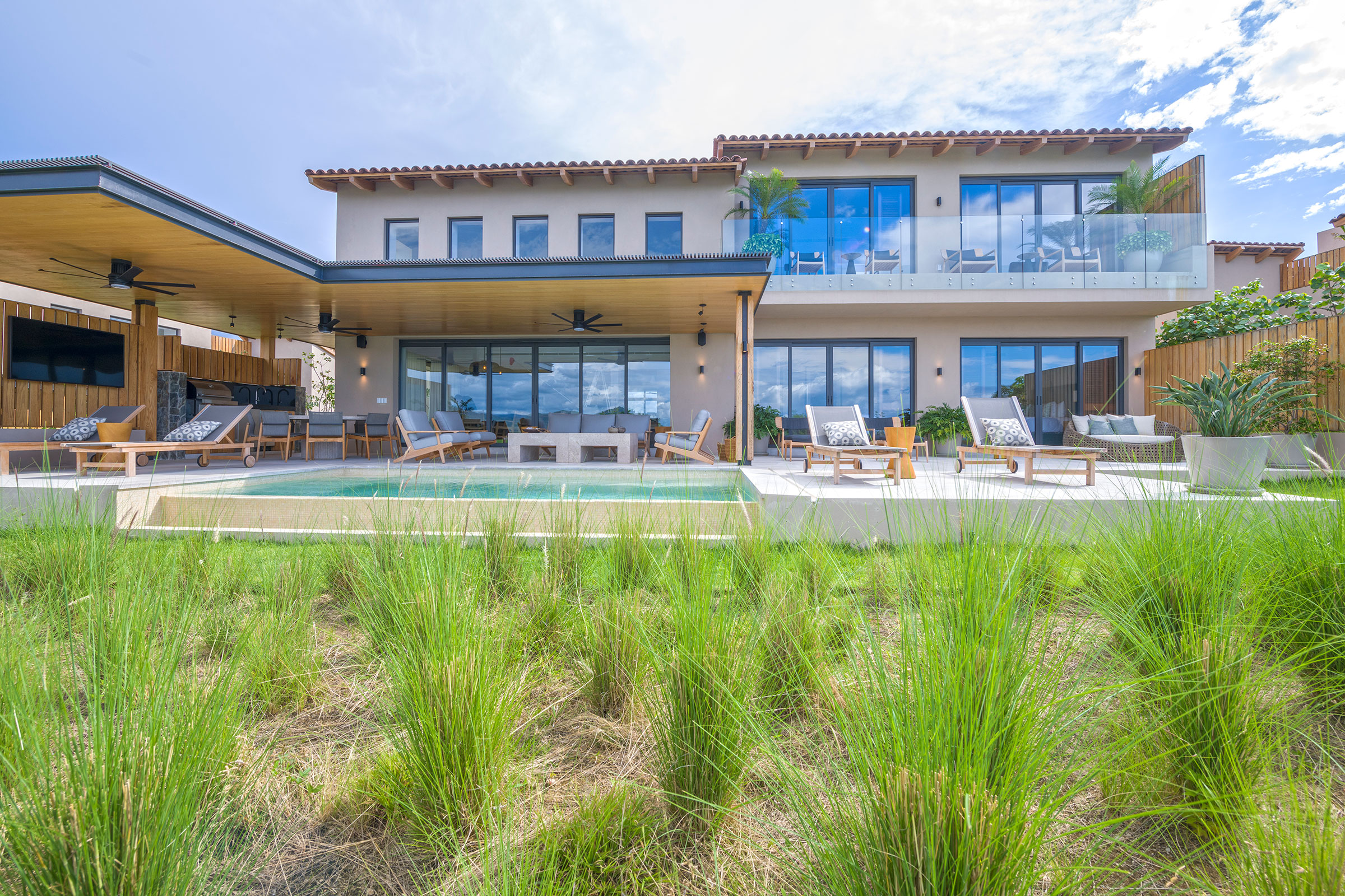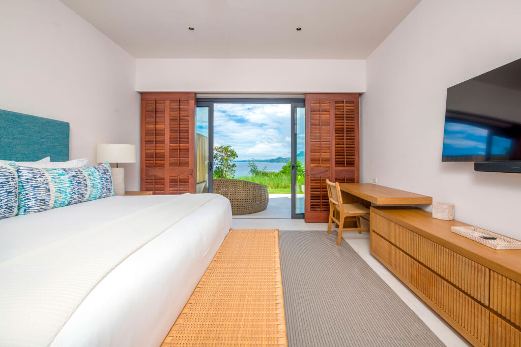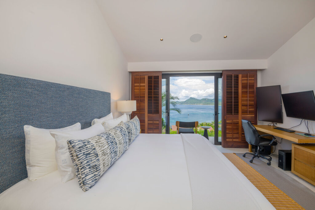 Surrounded by lush tropical foliage, the outdoor spaces feature a refreshing plunge pool, sun loungers, and a fully equipped al fresco kitchen—perfect for open-air dining and relaxation. Inside, the villa blends modern sophistication with natural textures, offering spacious living areas that exude comfort and tranquility.