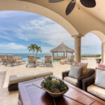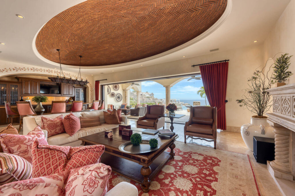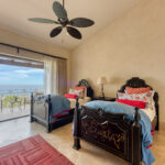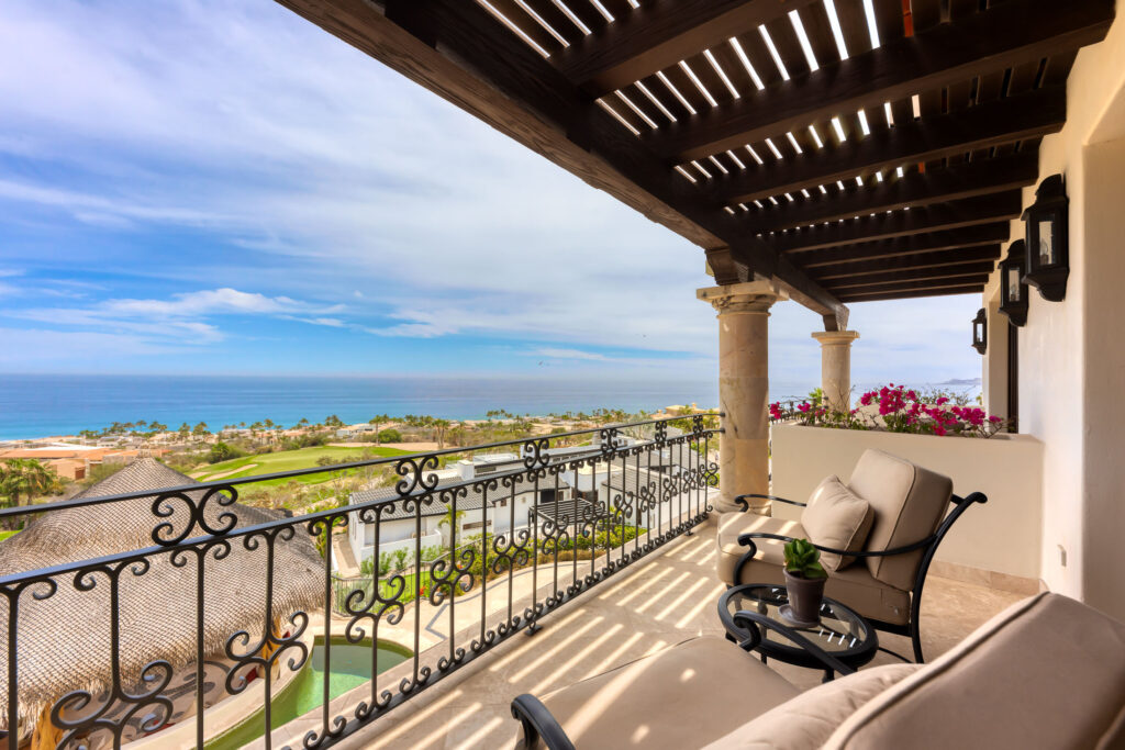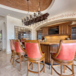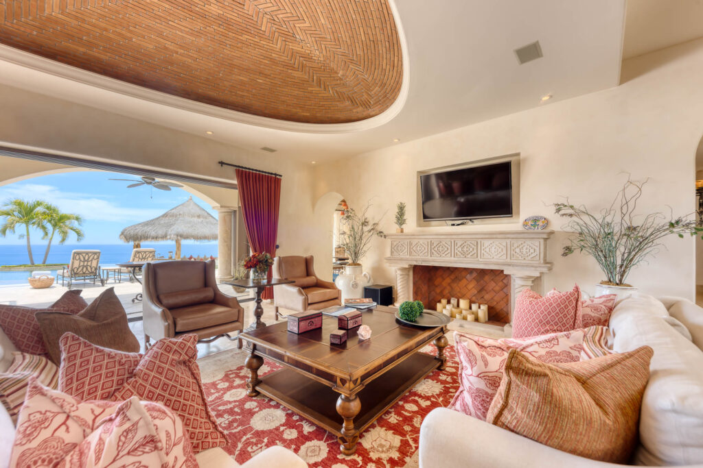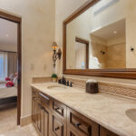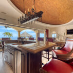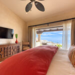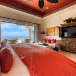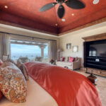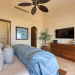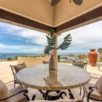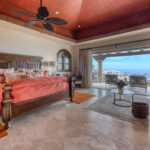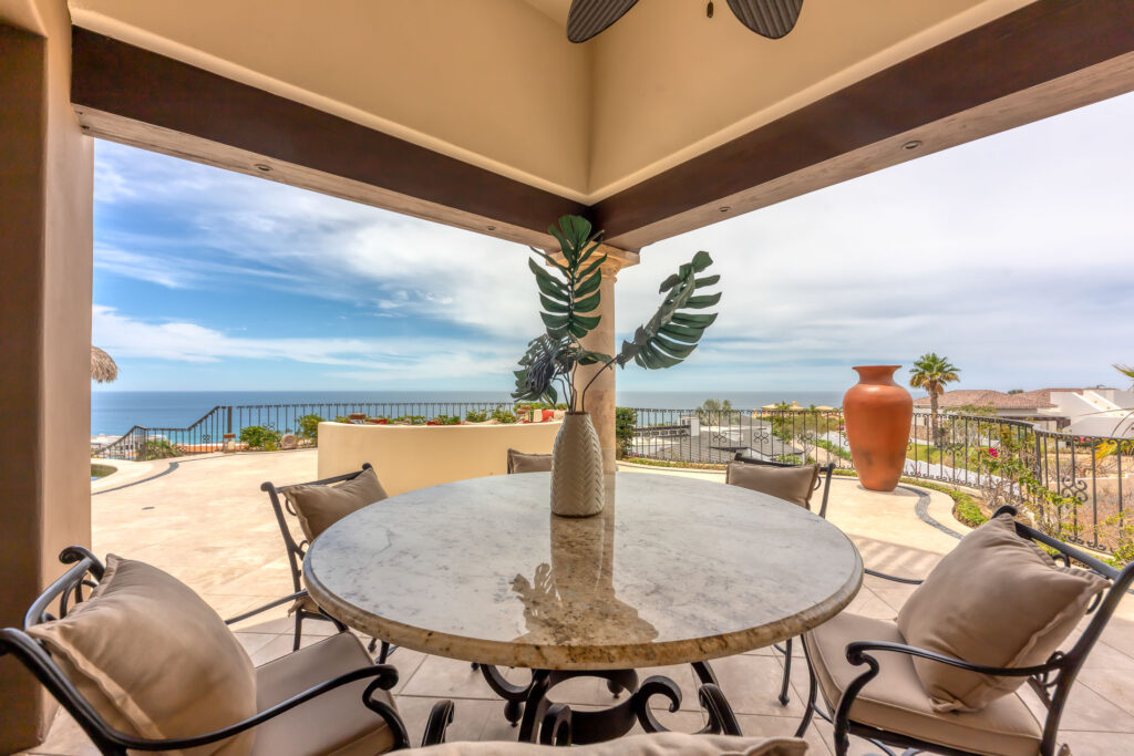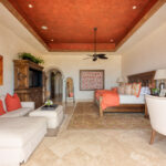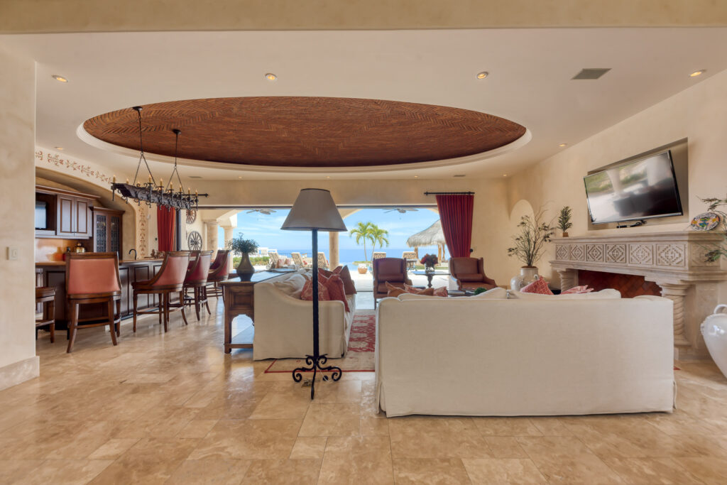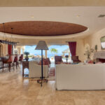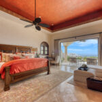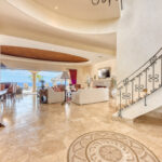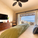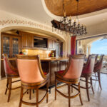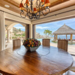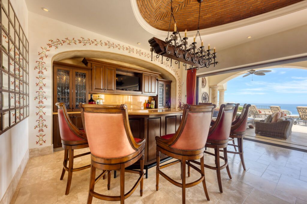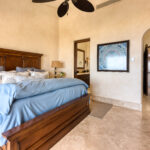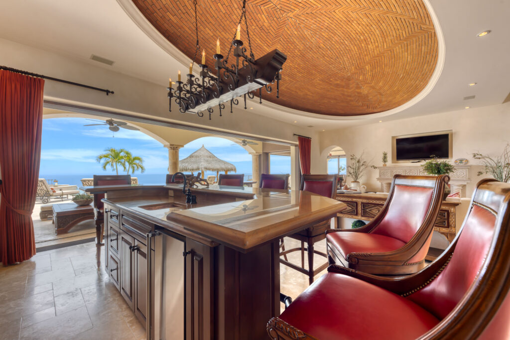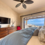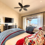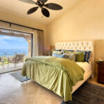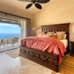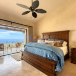 The villa’s interior is equally impressive, with a ground floor that opens to a richly appointed living room, featuring a fireplace, flatscreen TV, and a bar area. The space extends to include a dining table for ten and a gourmet kitchen with elegant wood cabinetry and island seating. The second level, accessible by a private elevator or staircase, houses bedrooms with ensuite baths, each leading to terrace seating offering elevated ocean views. The villa’s location in Fundadores grants access to Club Fundadores’ exclusive amenities like swimming, fitness, dining, and spa services. With almost daily maid service and proximity to the diverse attractions of Puerto Los Cabos, this villa combines the privacy of a luxury home with the amenities of a high-end resort.