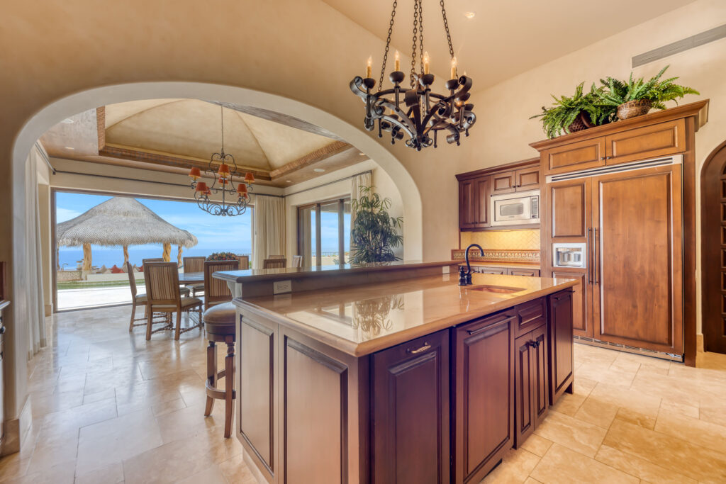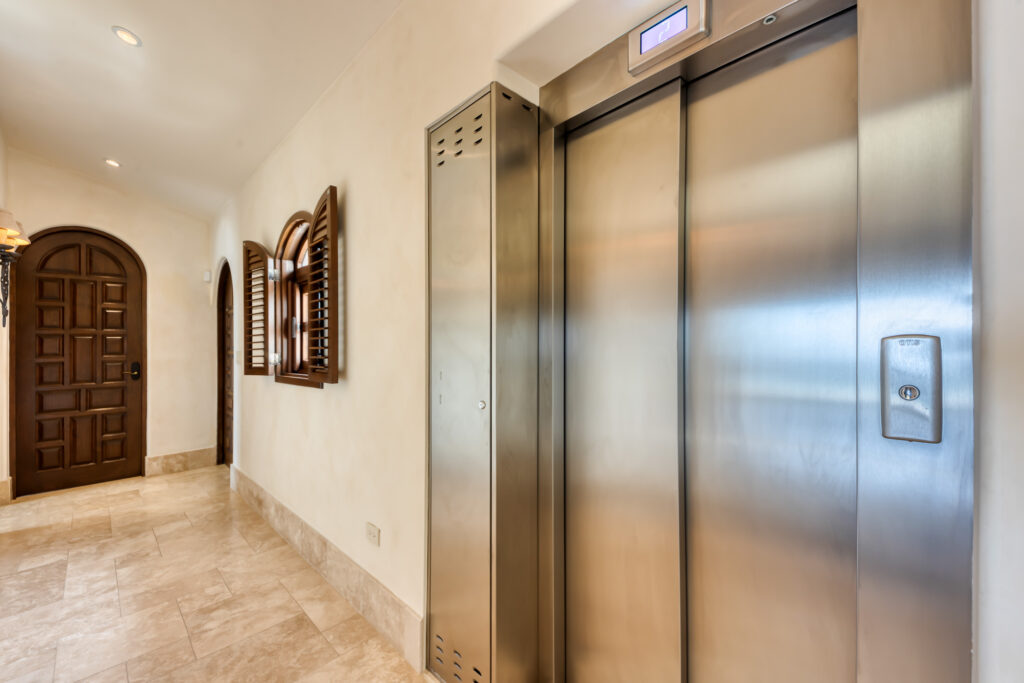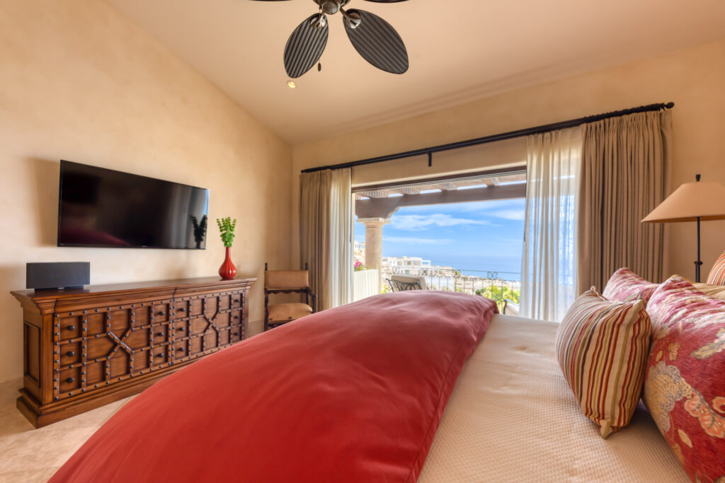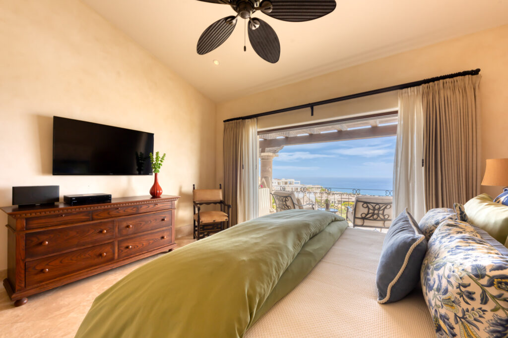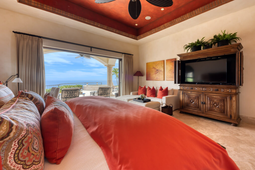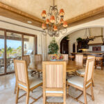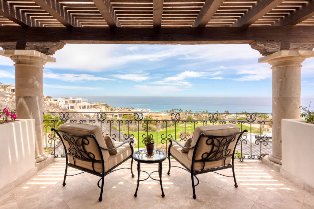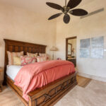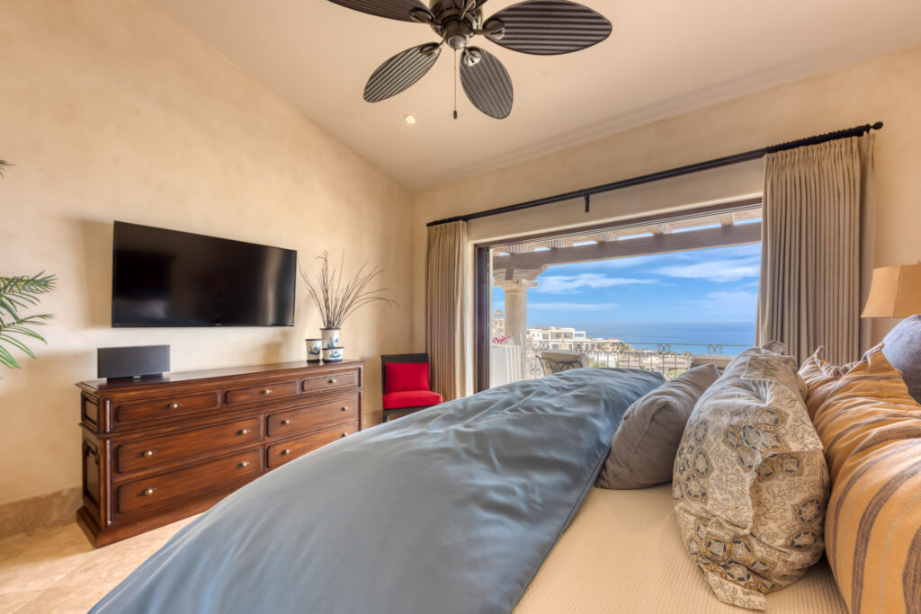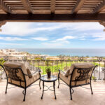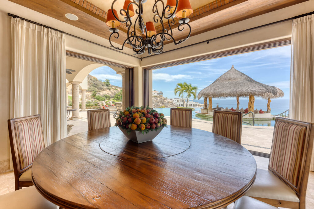 The villa’s interior is equally impressive, with a ground floor that opens to a richly appointed living room, featuring a fireplace, flatscreen TV, and a bar area. The space extends to include a dining table for ten and a gourmet kitchen with elegant wood cabinetry and island seating. The second level, accessible by a private elevator or staircase, houses bedrooms with ensuite baths, each leading to terrace seating offering elevated ocean views. The villa’s location in Fundadores grants access to Club Fundadores’ exclusive amenities like swimming, fitness, dining, and spa services. With almost daily maid service and proximity to the diverse attractions of Puerto Los Cabos, this villa combines the privacy of a luxury home with the amenities of a high-end resort.