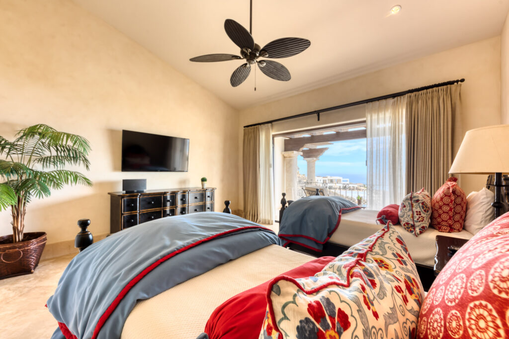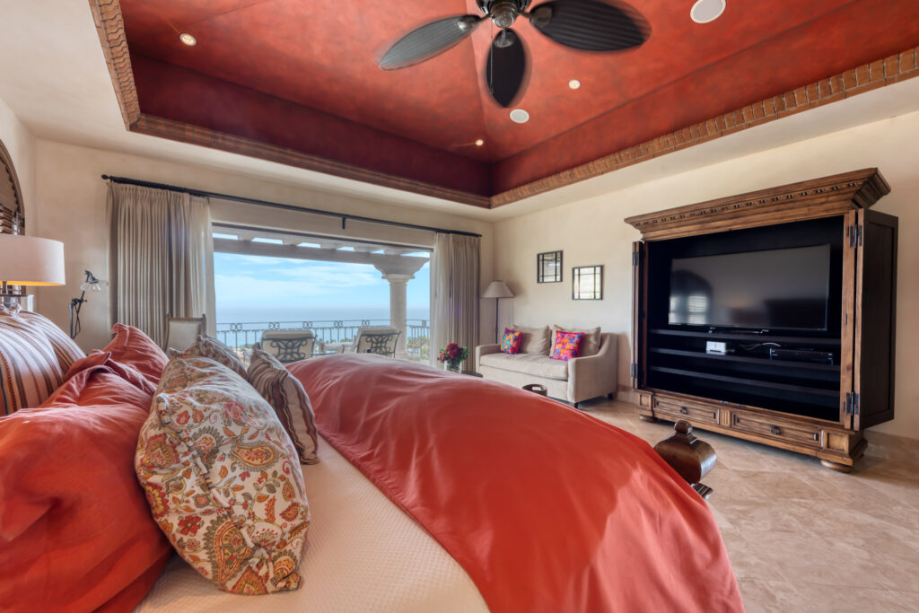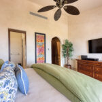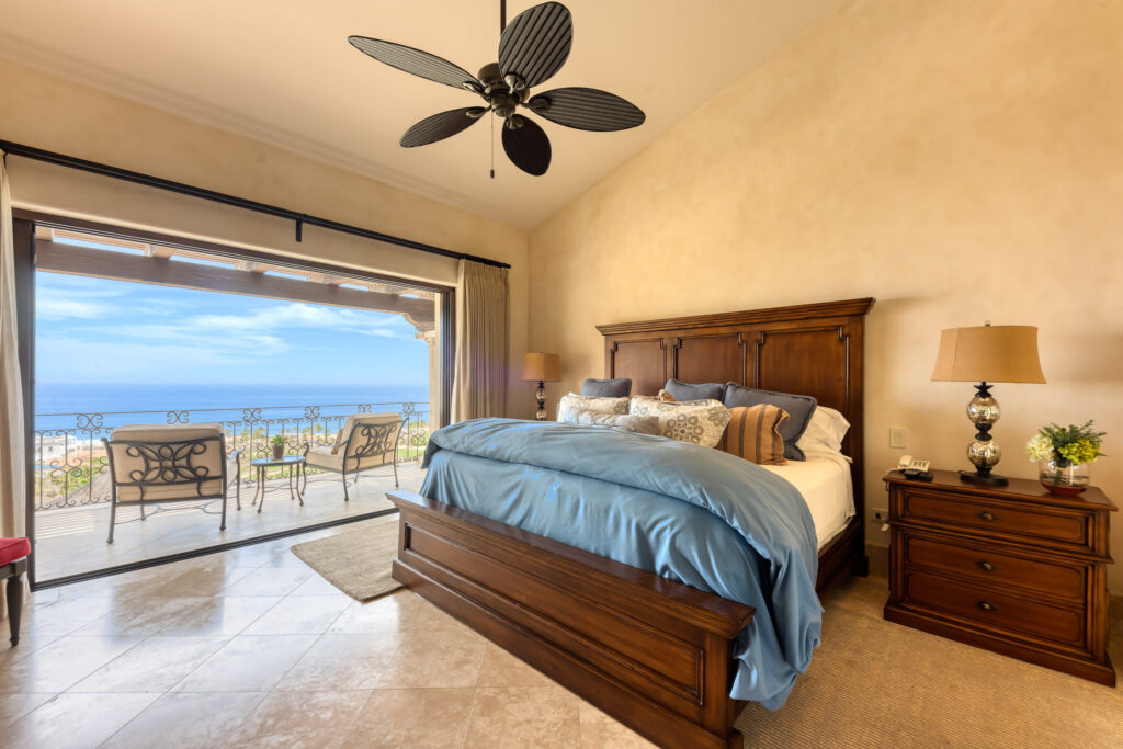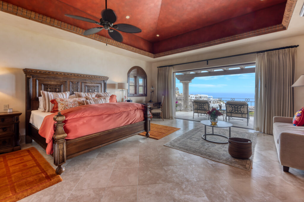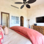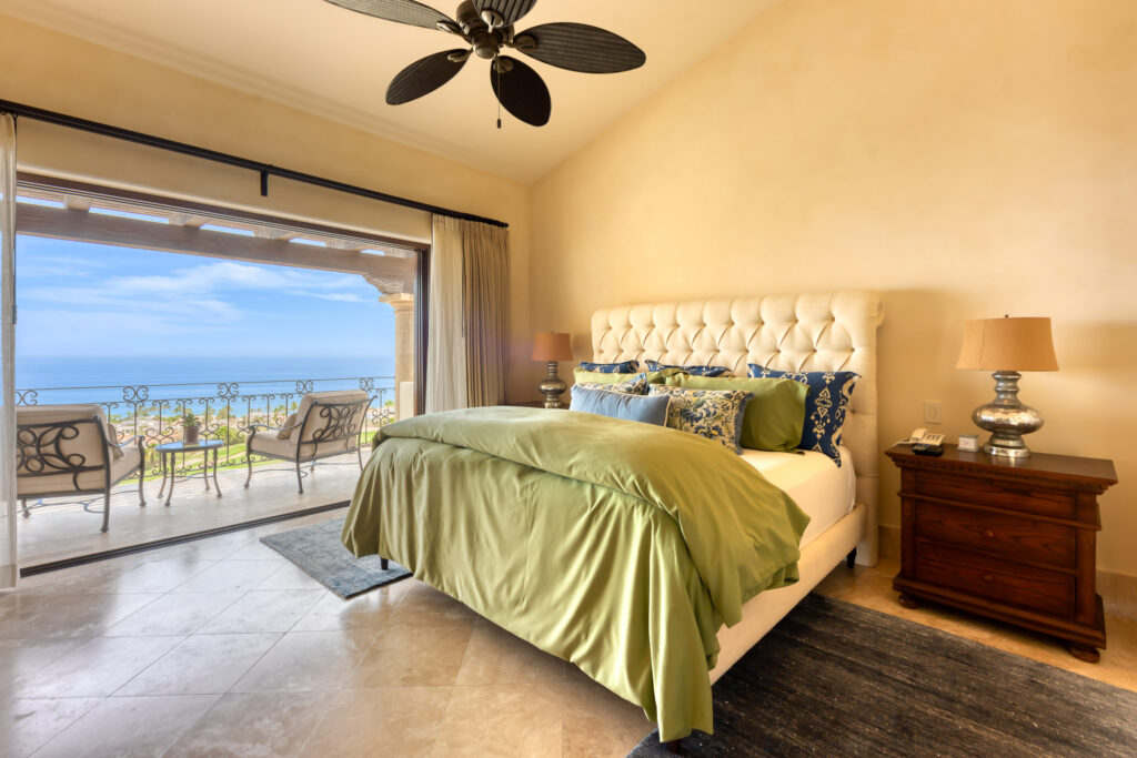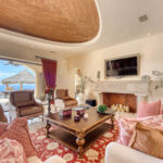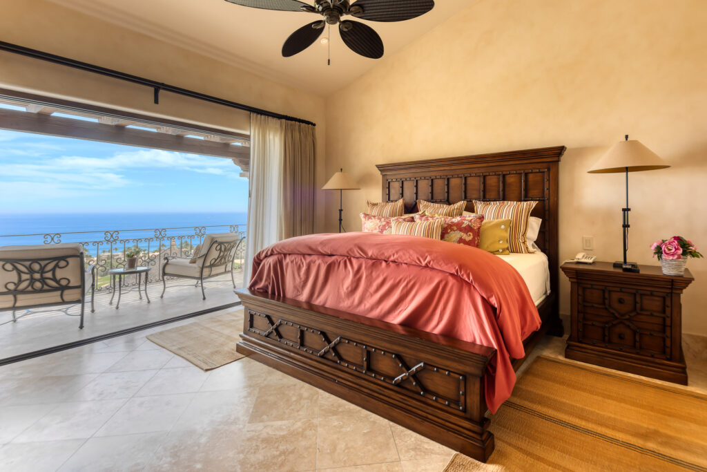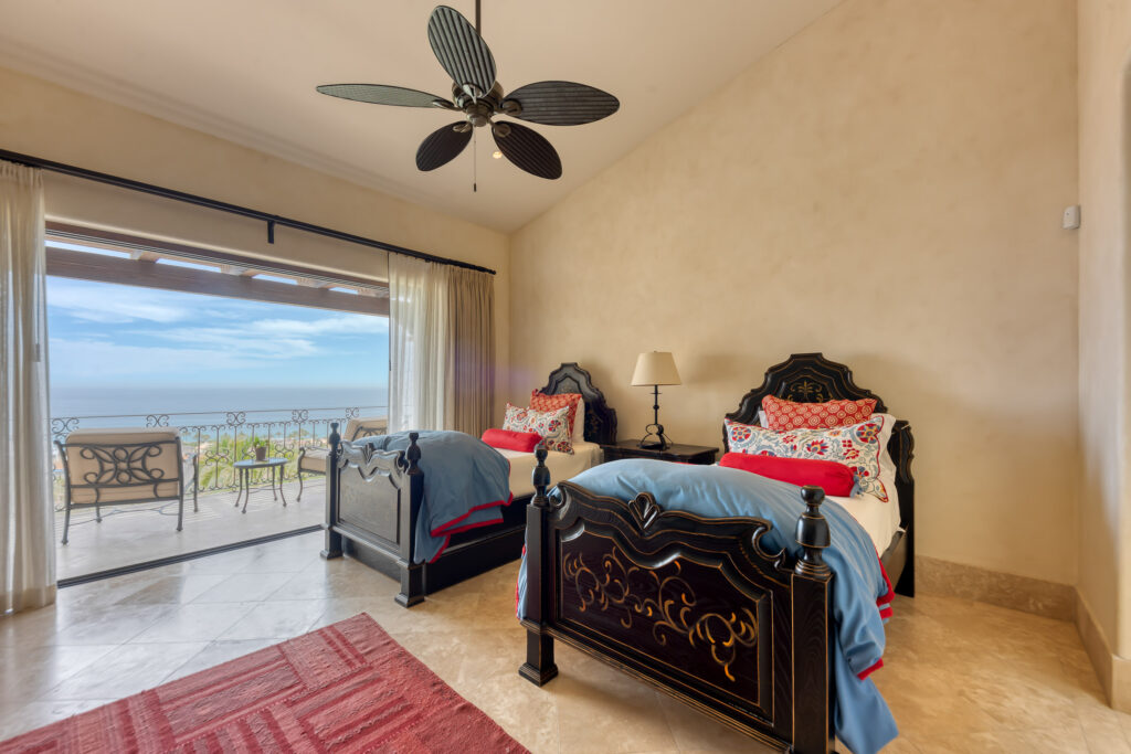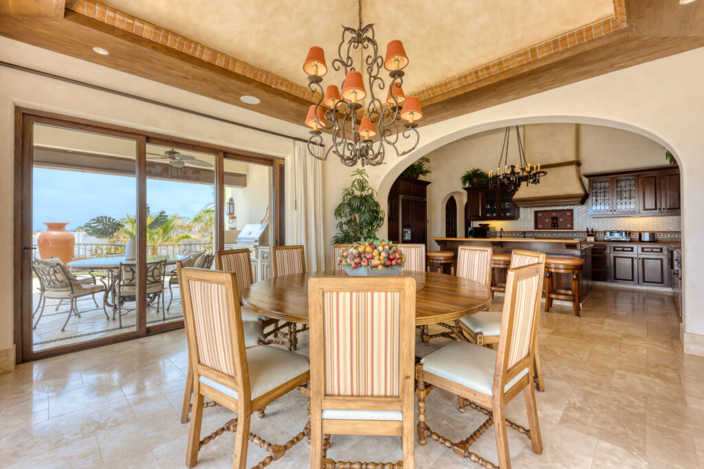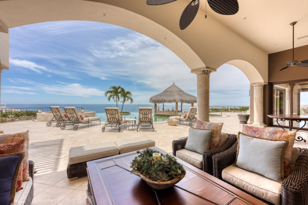The villa’s interior is equally impressive, with a ground floor that opens to a richly appointed living room, featuring a fireplace, flatscreen TV, and a bar area. The space extends to include a dining table for ten and a gourmet kitchen with elegant wood cabinetry and island seating. The second level, accessible by a private elevator or staircase, houses bedrooms with ensuite baths, each leading to terrace seating offering elevated ocean views. The villa’s location in Fundadores grants access to Club Fundadores’ exclusive amenities like swimming, fitness, dining, and spa services. With almost daily maid service and proximity to the diverse attractions of Puerto Los Cabos, this villa combines the privacy of a luxury home with the amenities of a high-end resort.