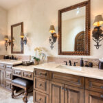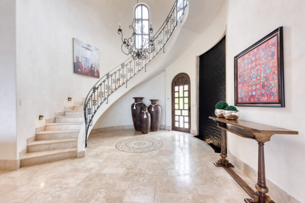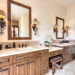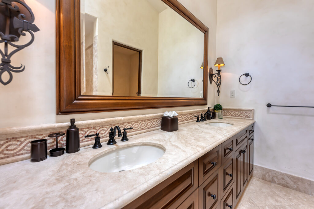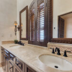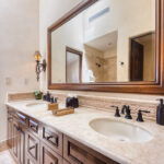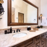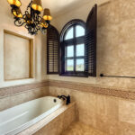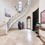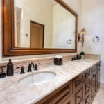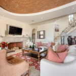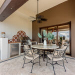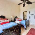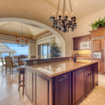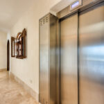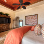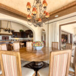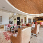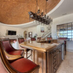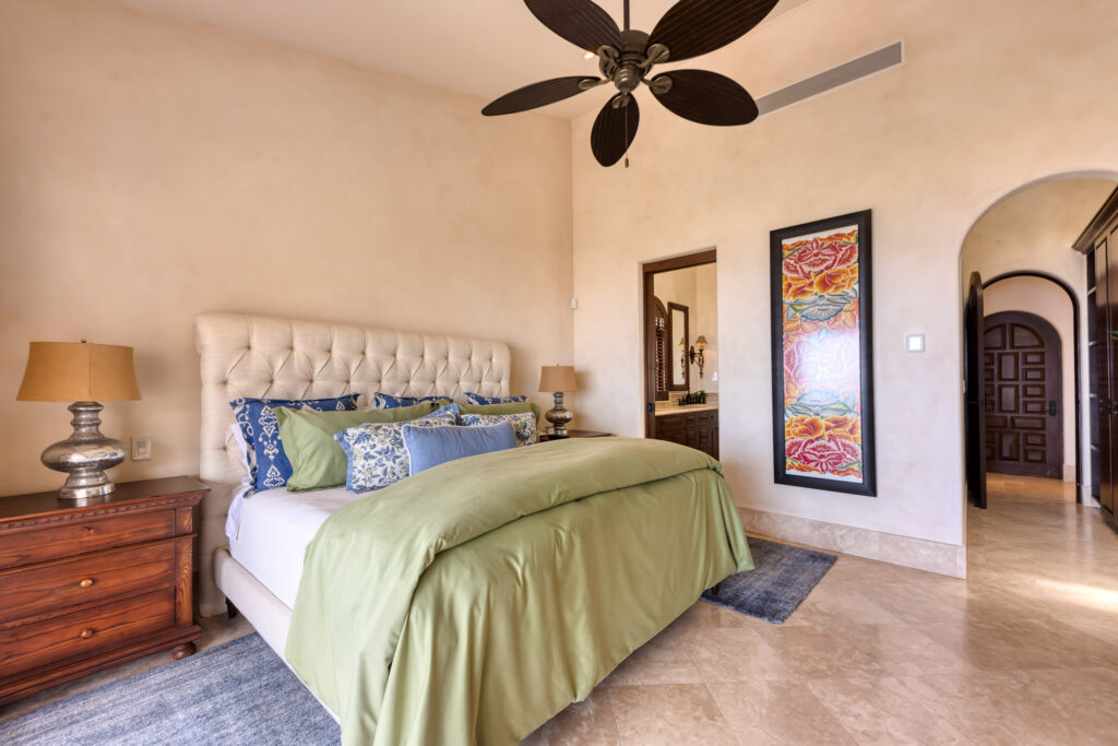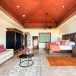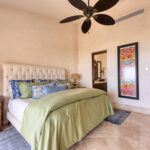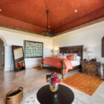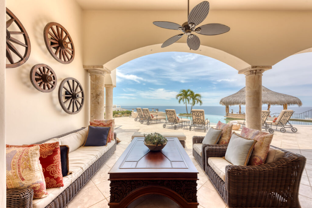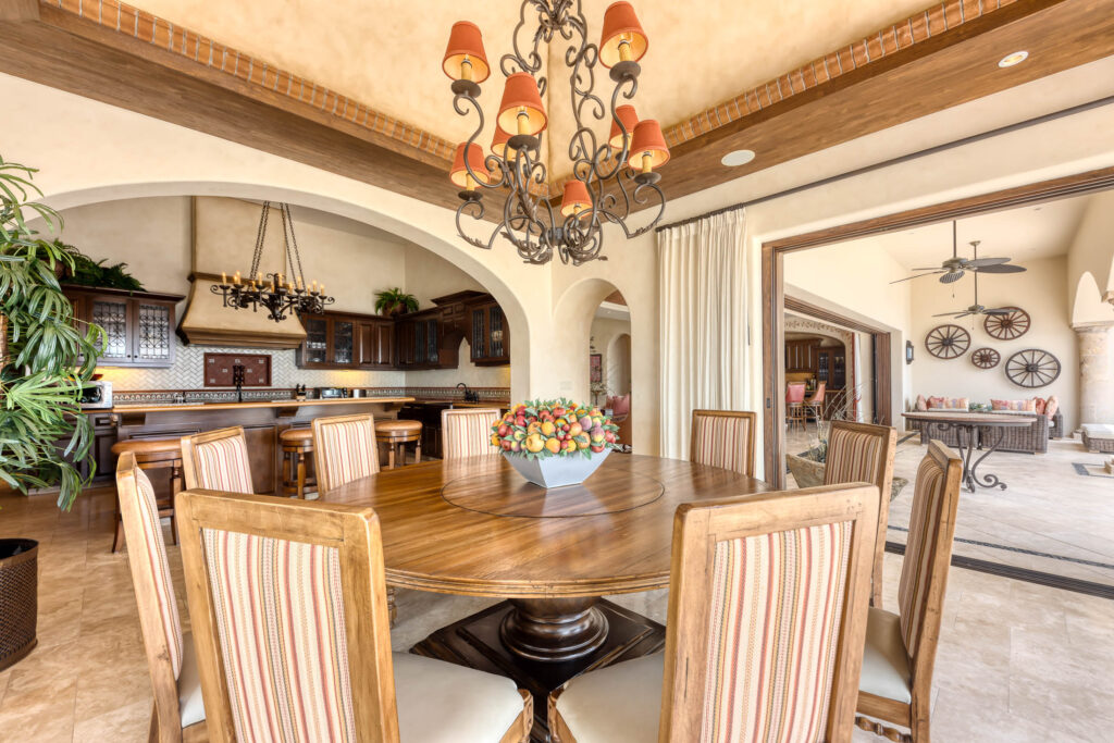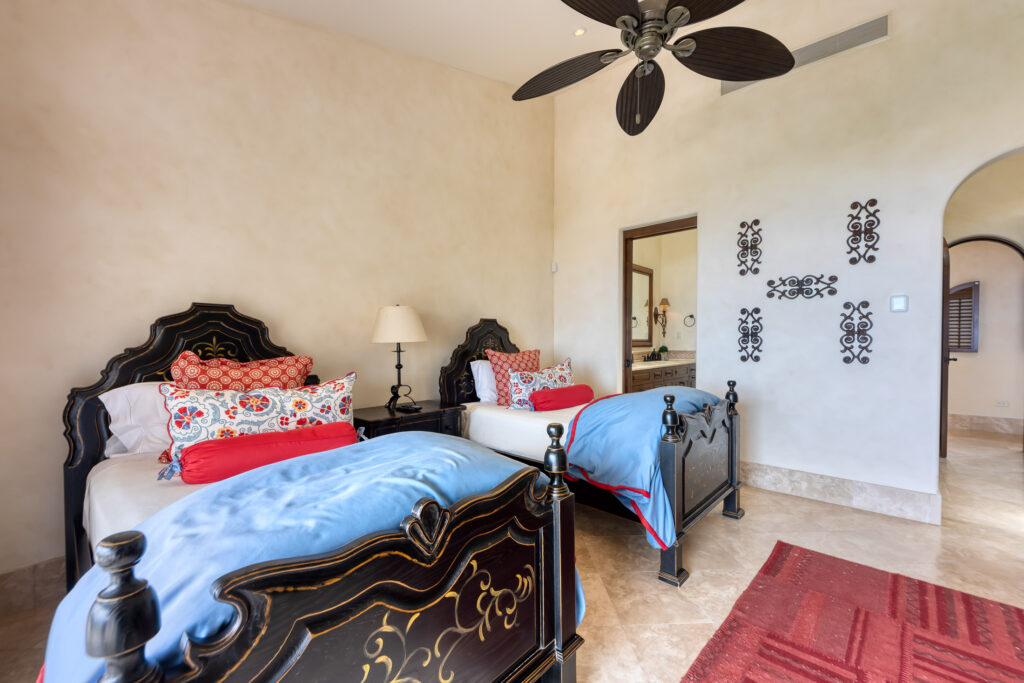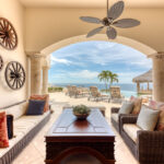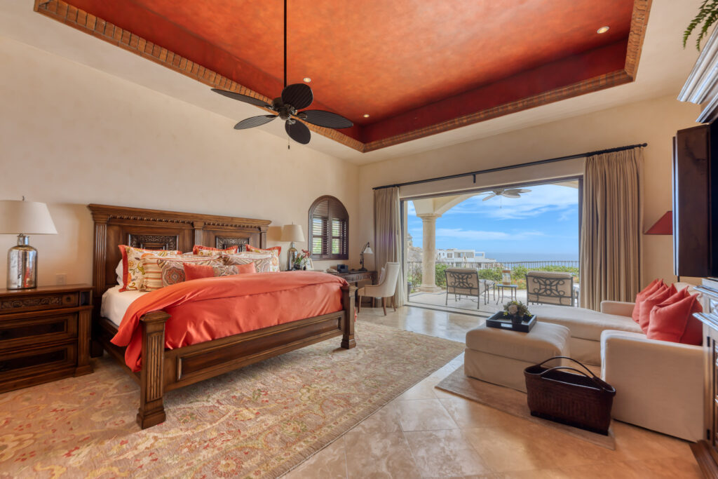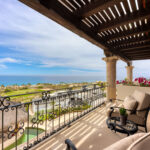 The villa’s interior is equally impressive, with a ground floor that opens to a richly appointed living room, featuring a fireplace, flatscreen TV, and a bar area. The space extends to include a dining table for ten and a gourmet kitchen with elegant wood cabinetry and island seating. The second level, accessible by a private elevator or staircase, houses bedrooms with ensuite baths, each leading to terrace seating offering elevated ocean views. The villa’s location in Fundadores grants access to Club Fundadores’ exclusive amenities like swimming, fitness, dining, and spa services. With almost daily maid service and proximity to the diverse attractions of Puerto Los Cabos, this villa combines the privacy of a luxury home with the amenities of a high-end resort.