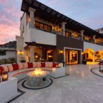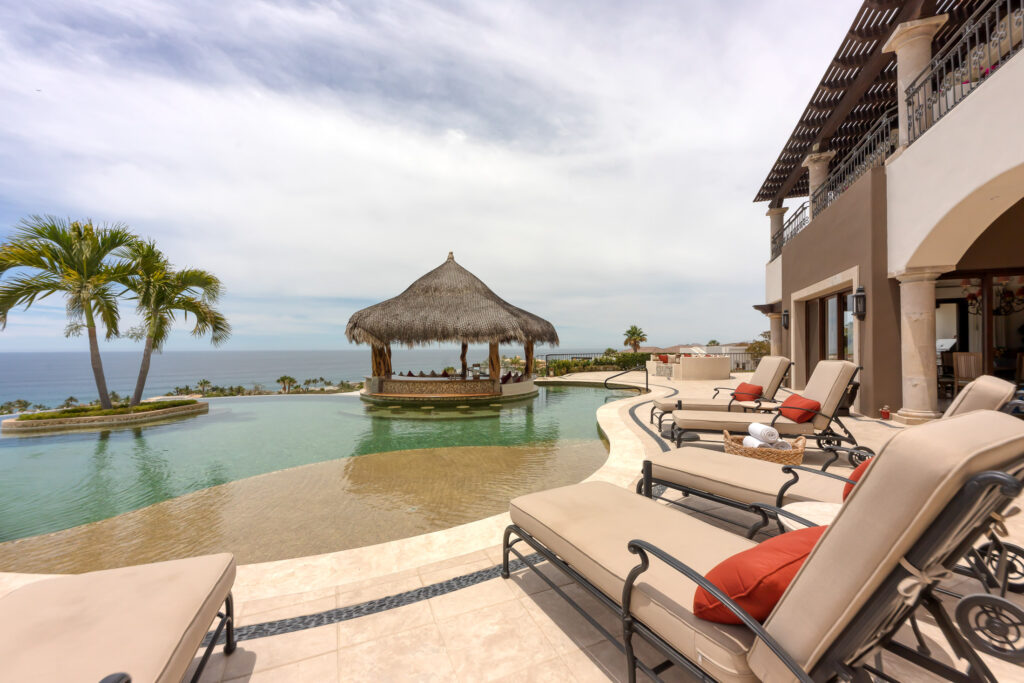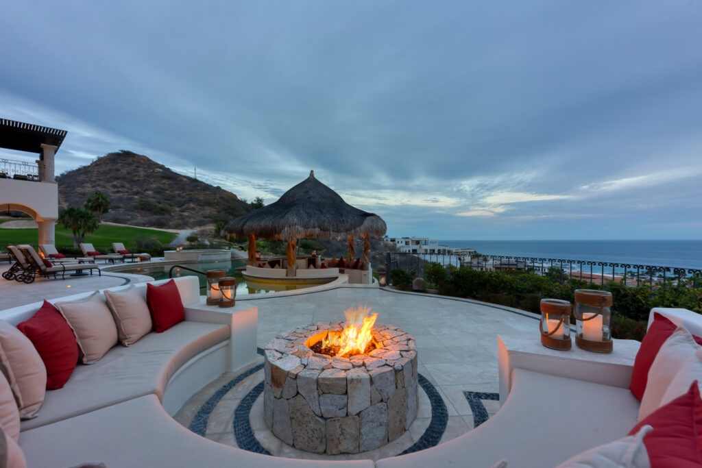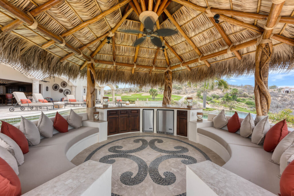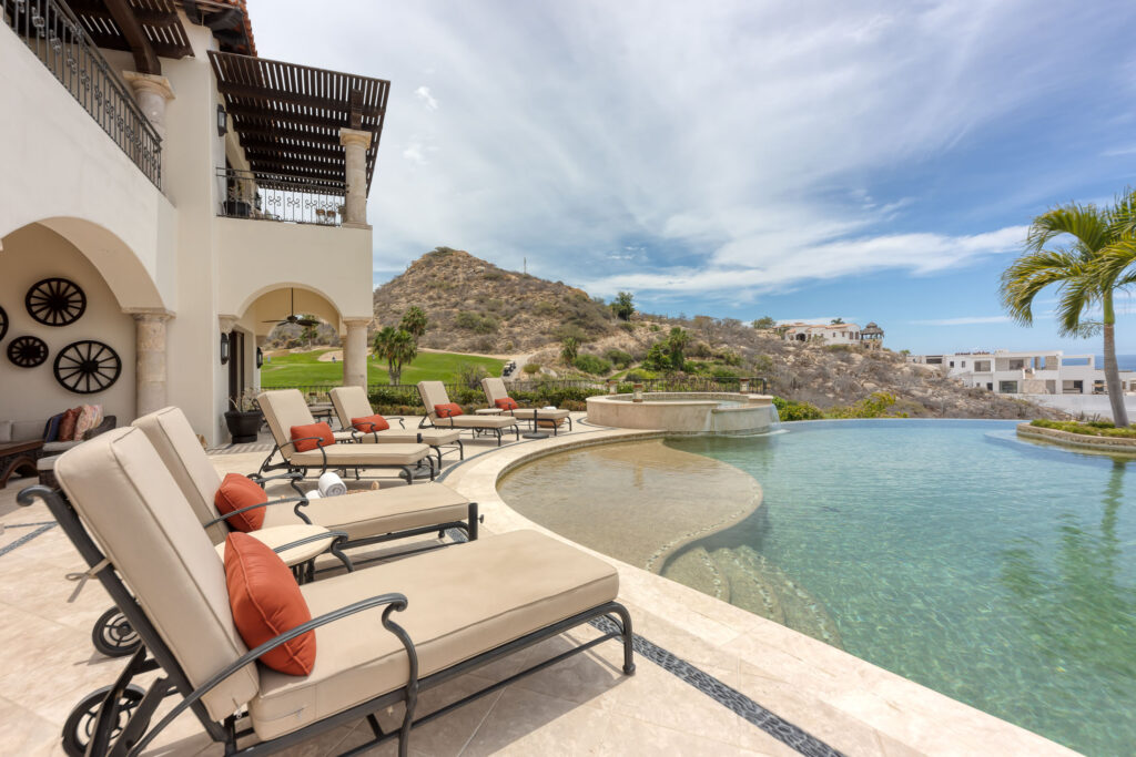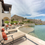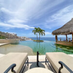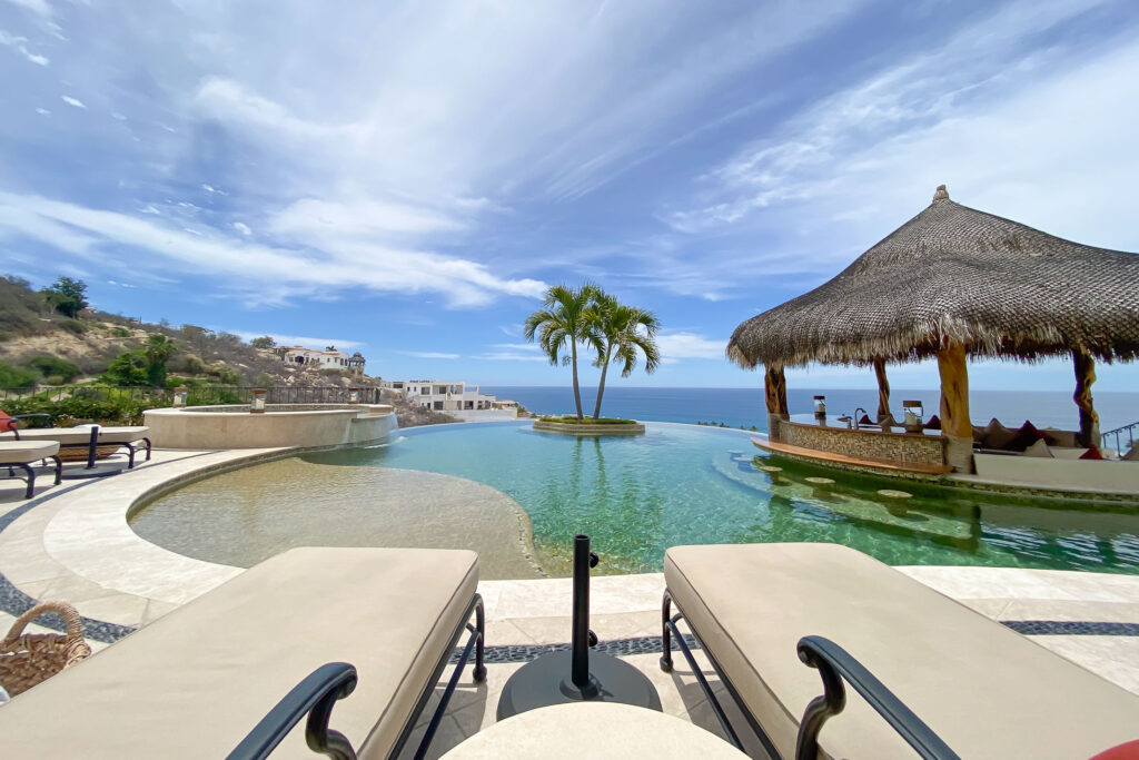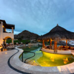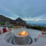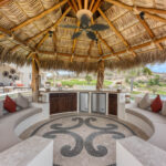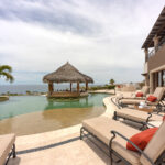 Nestled in the prestigious Fundadores community of Puerto Los Cabos, this luxurious villa is a personal resort within a resort, perfect for up to 12 guests. Perched on a hillside, it offers stunning panoramic views of the ocean, making it an ideal retreat for those seeking an upscale vacation experience. The villa’s centerpiece is a magnificent outdoor area featuring a resort-like infinity swimming pool with a swim-up bar under a thatched palapa and a lounge area. Additional luxuries include a jacuzzi tub, poolside loungers, a firepit with circular seating, and an outdoor living room complete with a barbecue and dining table, all set against the backdrop of breathtaking ocean vistas.