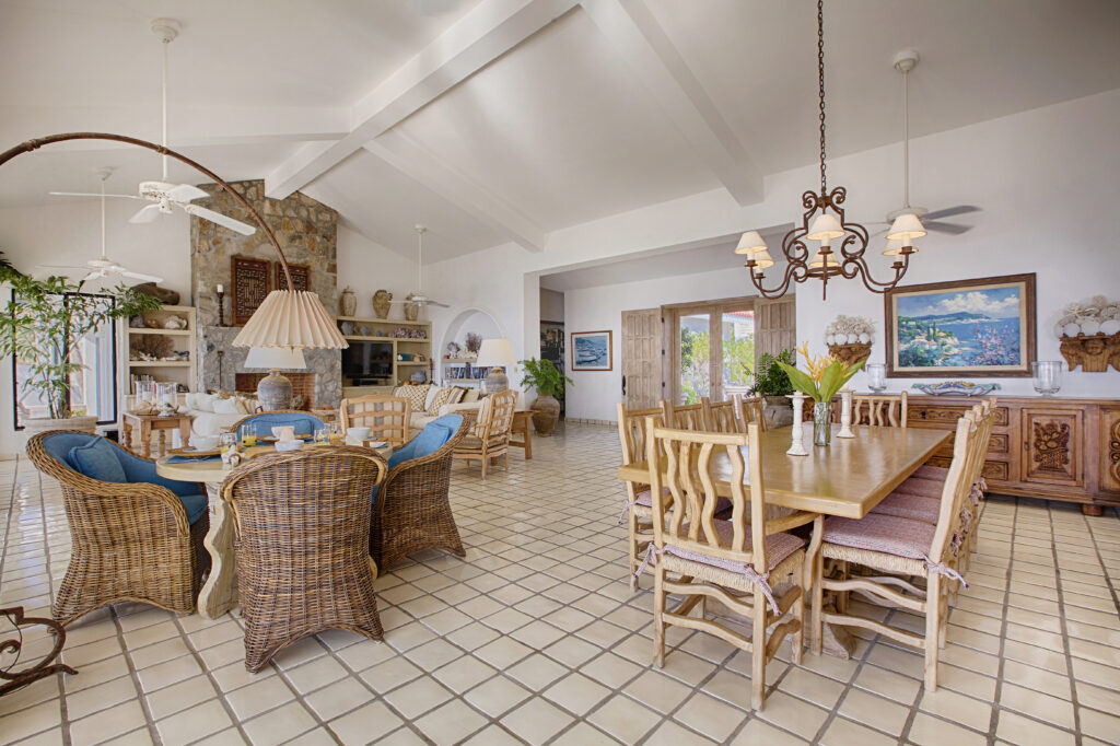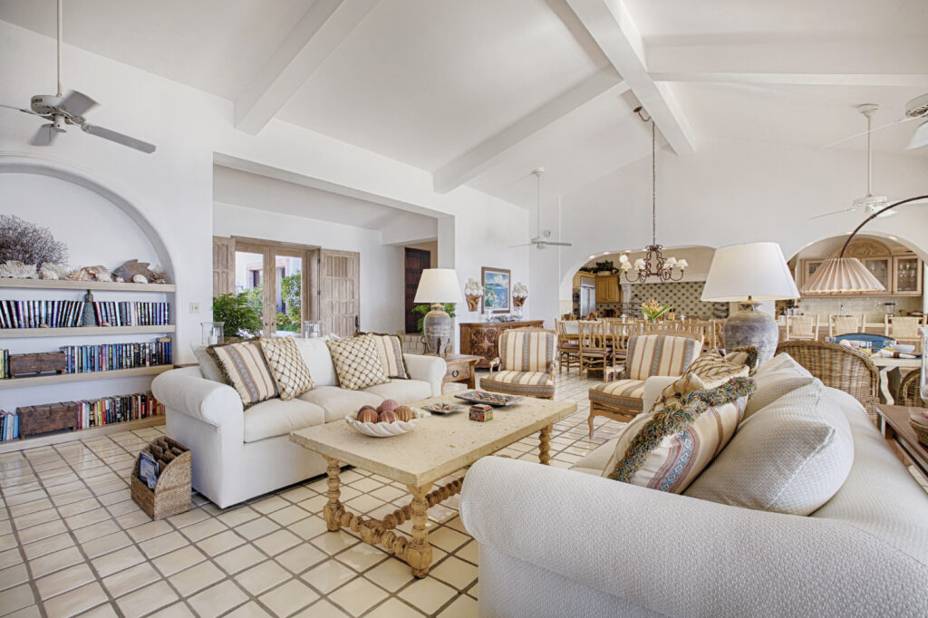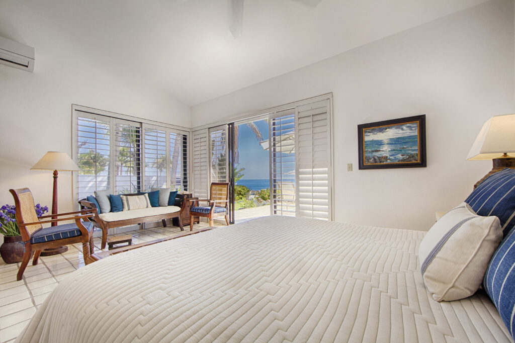 Perched atop a rocky elevation, the villa’s strategic location provides an expansive view over a private beach, offering an exclusive seaside experience. The interior is adorned with comfortable, white-washed furnishings and subtle décor, creating a welcoming environment perfect for relaxation and quality time with loved ones.