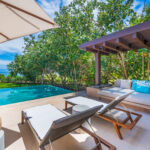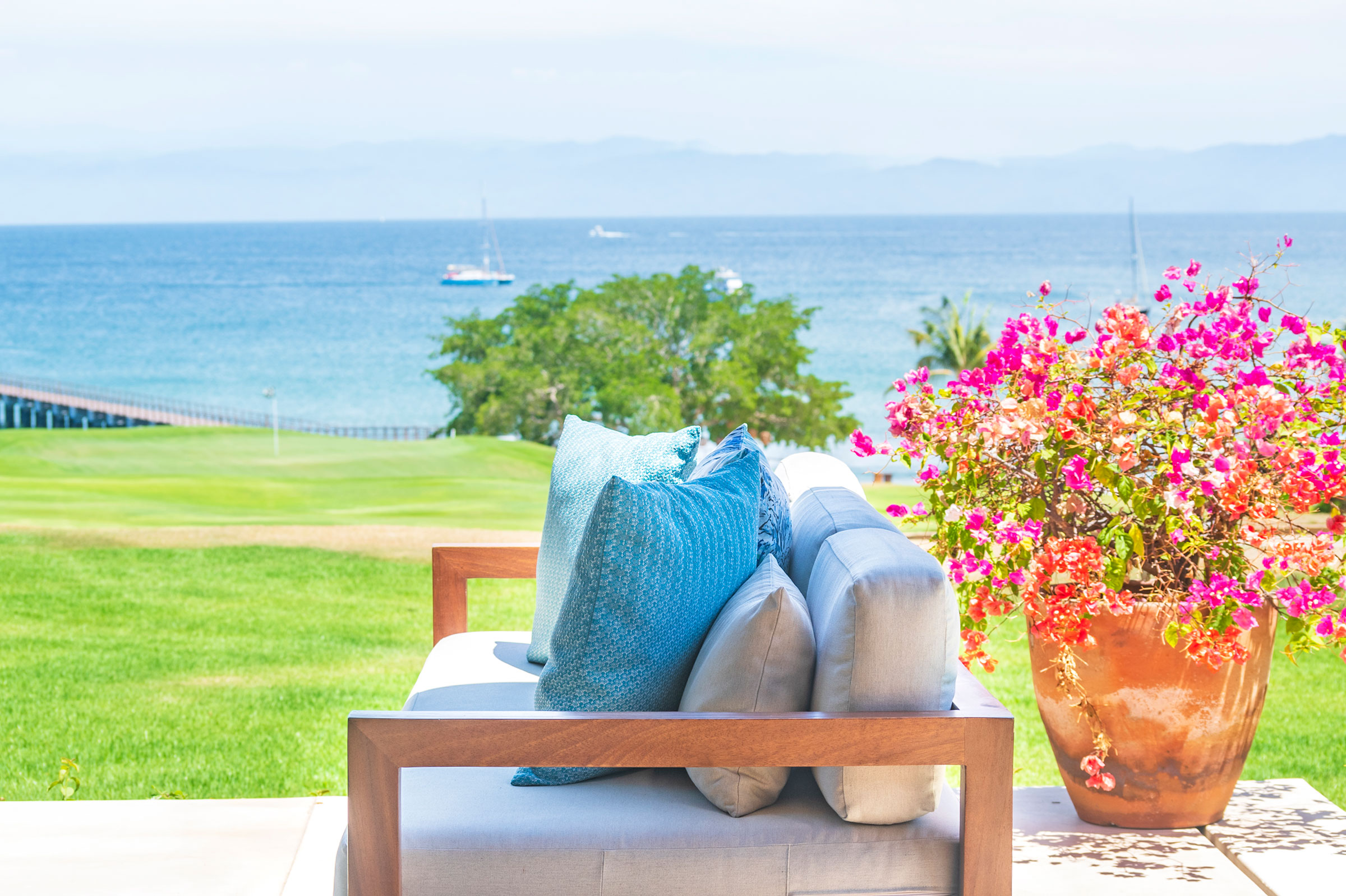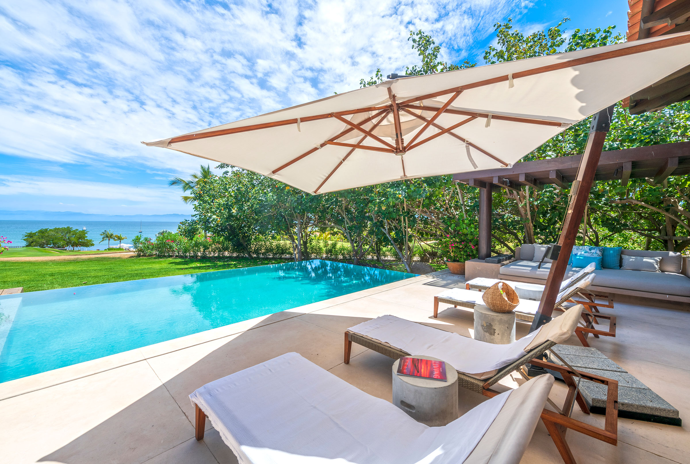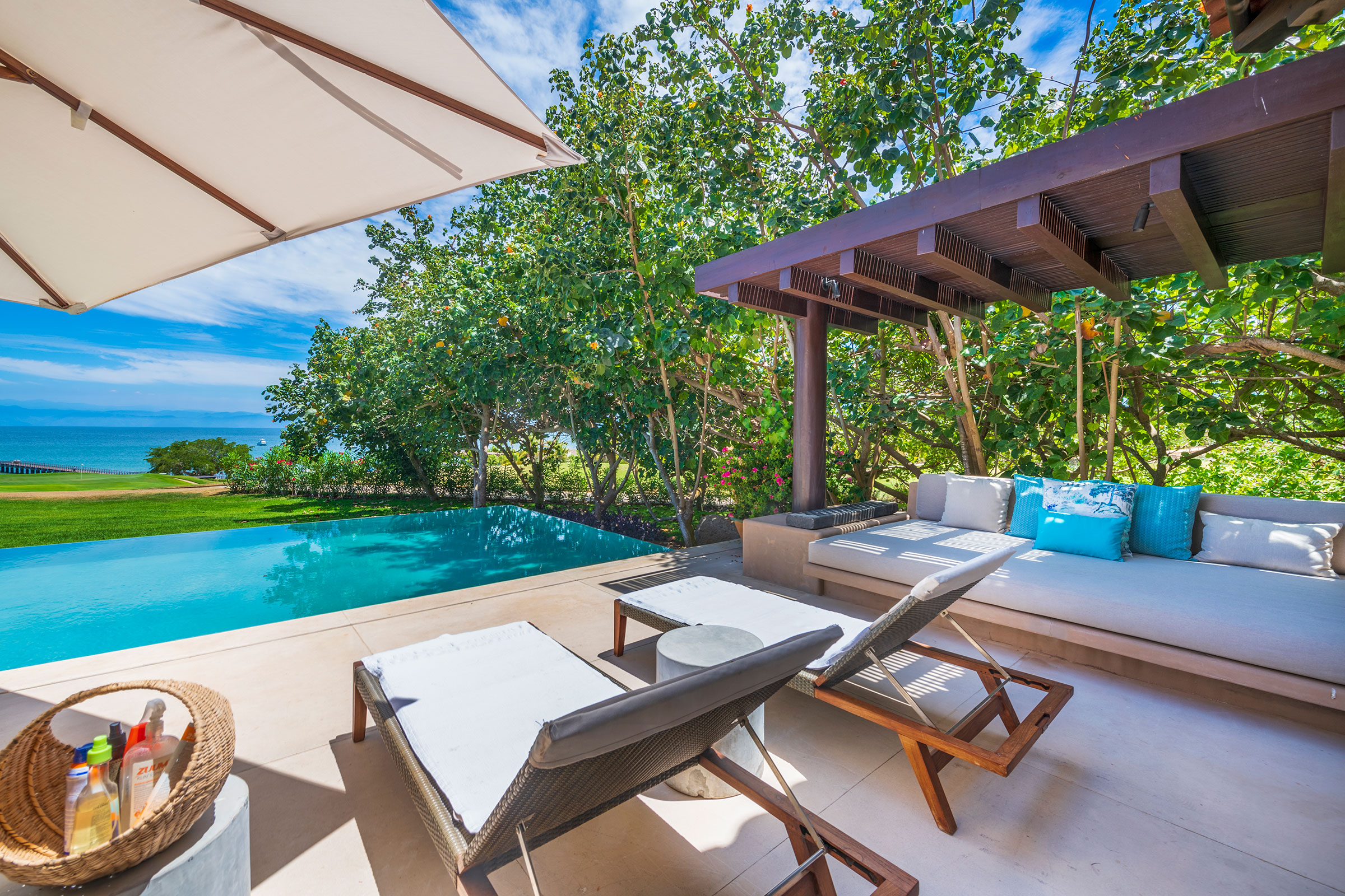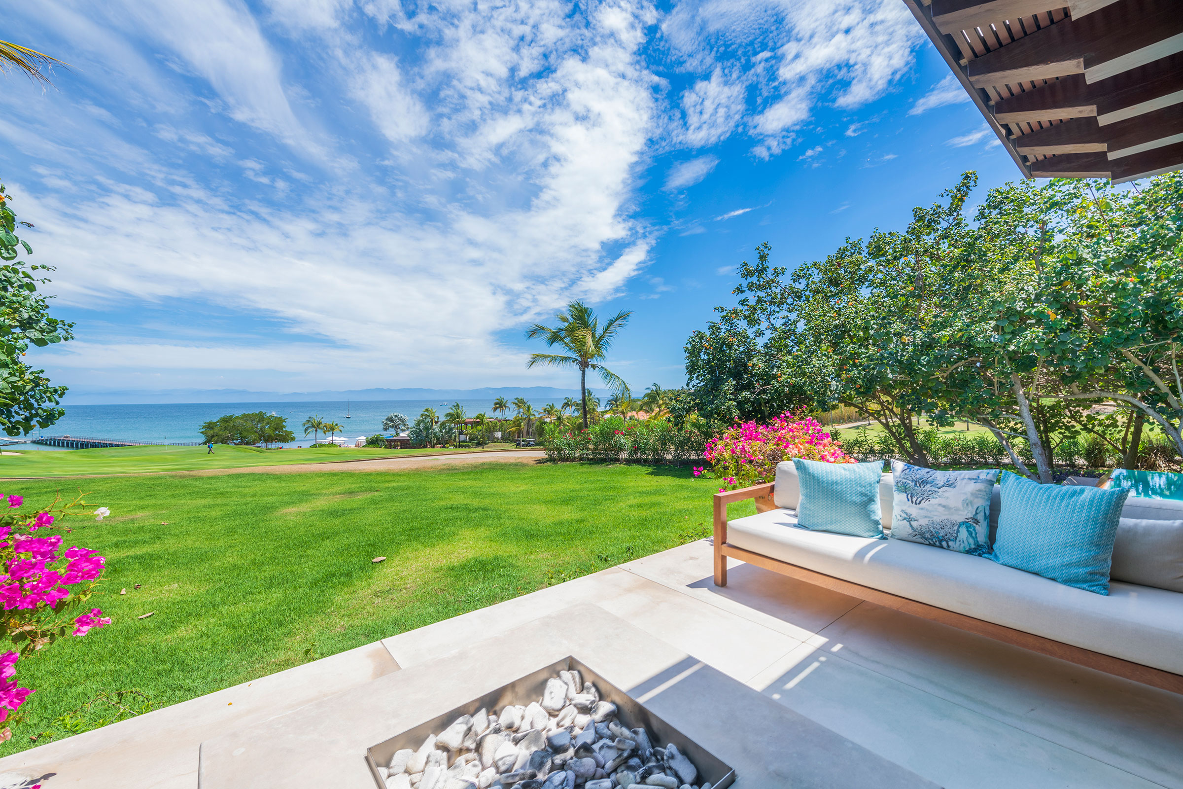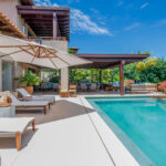 Perched within the exclusive gated enclave shared by the Four Seasons and St. Regis resorts, this beautifully designed five-bedroom villa offers panoramic views of Bahía de Banderas and the manicured fairways of Punta Mita’s Jack Nicklaus Signature Golf Course.